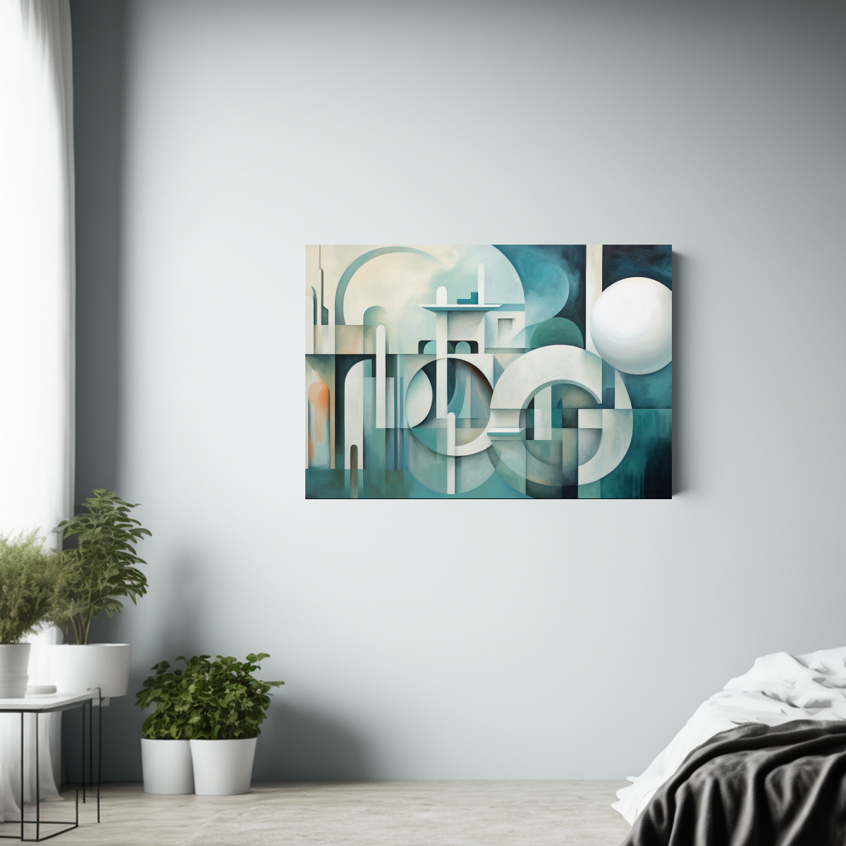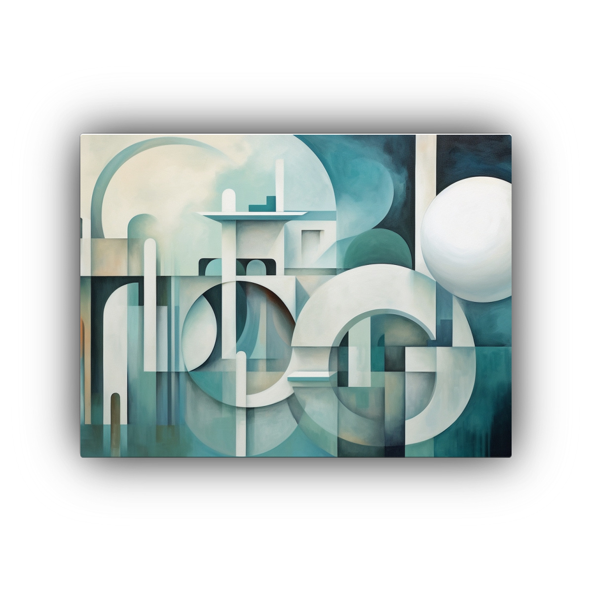 Este cuadro suprematista en bastidor sería perfecto para colocar sobre un sofá en una pared blanca para crear un impacto visual También puedes combinarlo con cojines en tonos turquesa y menta para lograr una armonía cromática en el espacio
