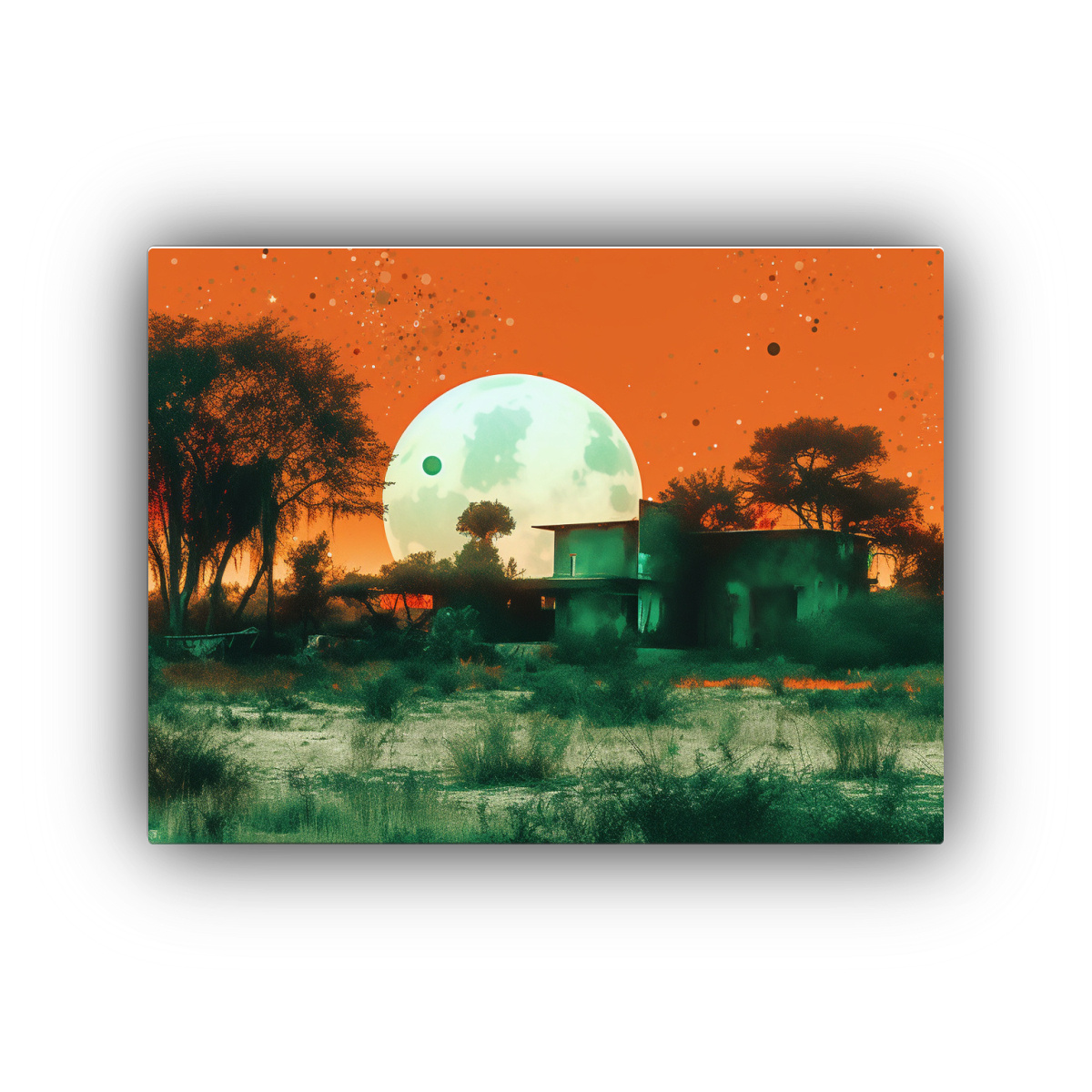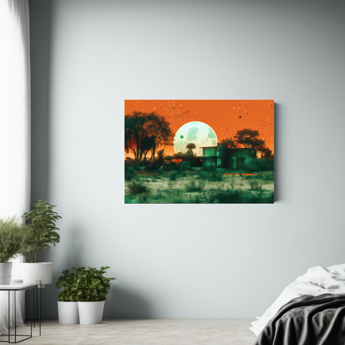 Pintura En Bastidor Vanguardia De Atardecer Naranja Y Verde Al Estilo Mani.