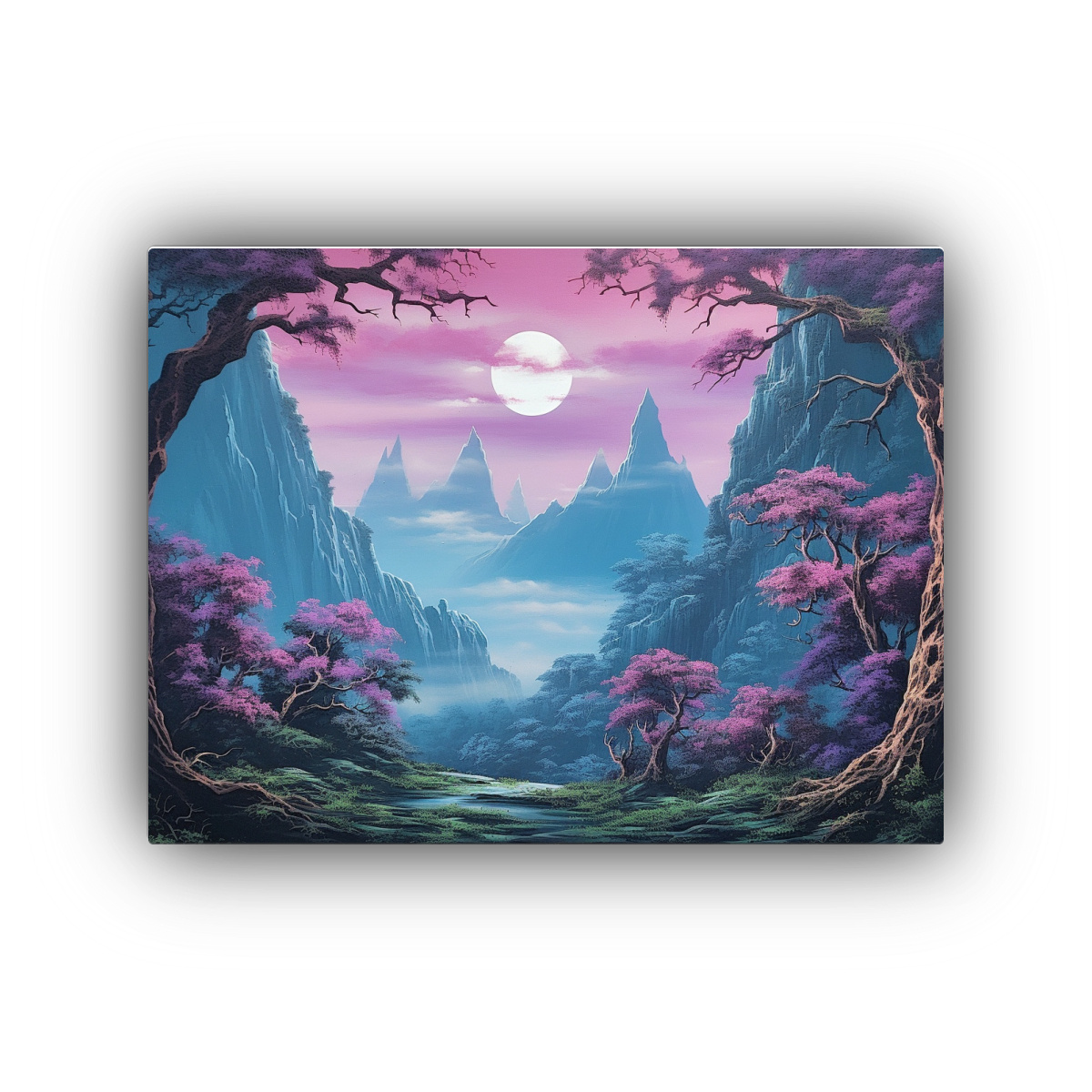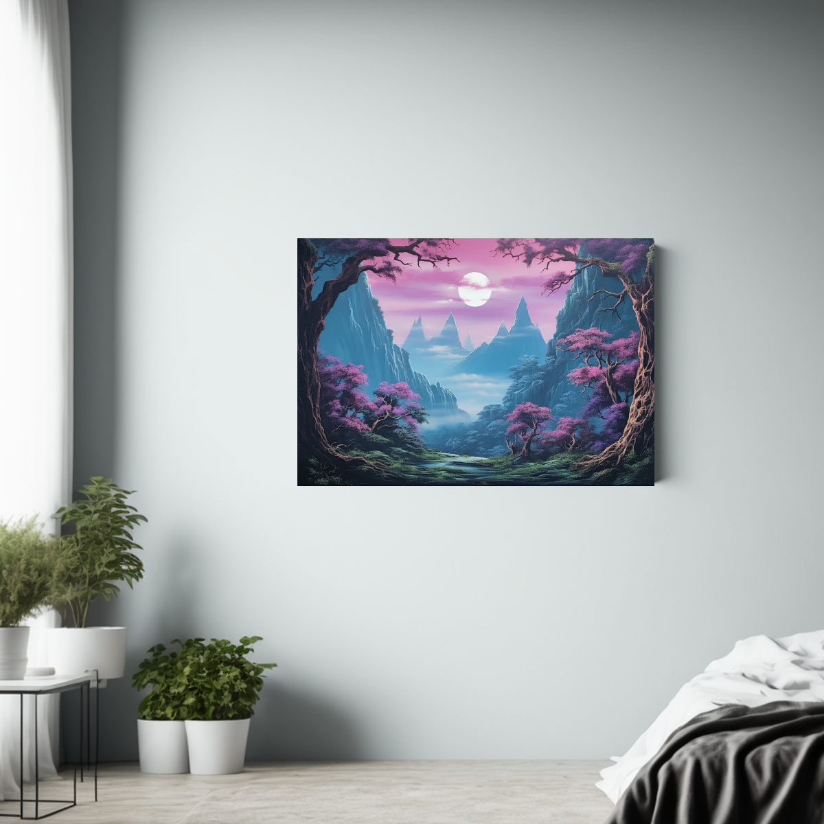 Pintura En Lienzo Azul De Montañas Y árboles Con Decoración De árboles.