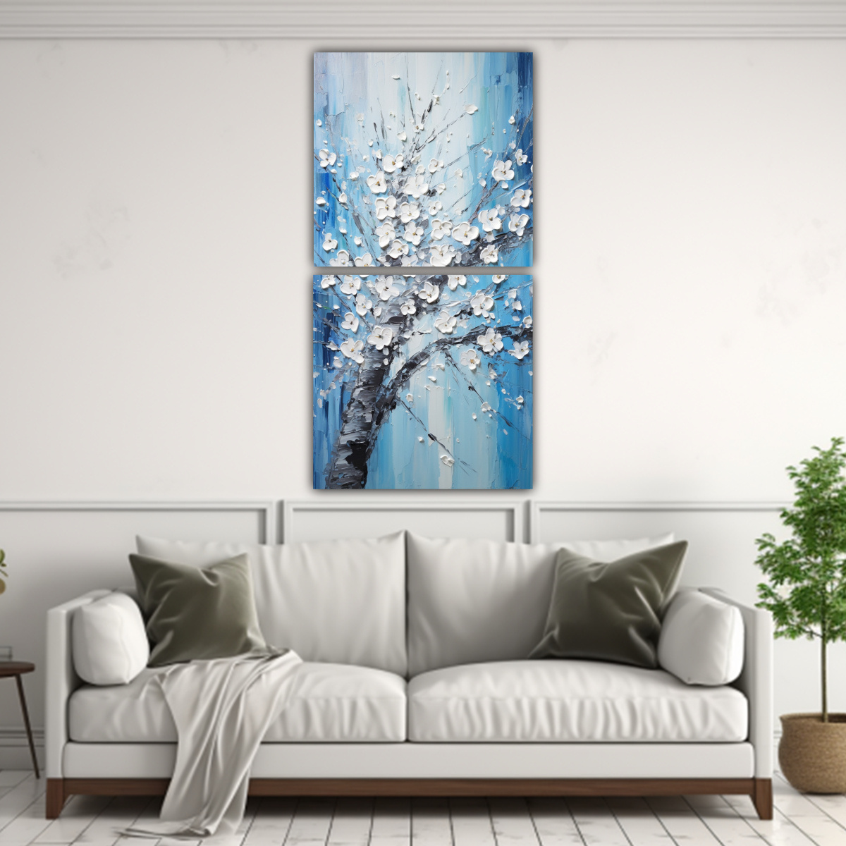 Pintura En Lienzo Calidez Inspiradora De Dos Artes Con Flores Cerezo Azules En La Decoración.
