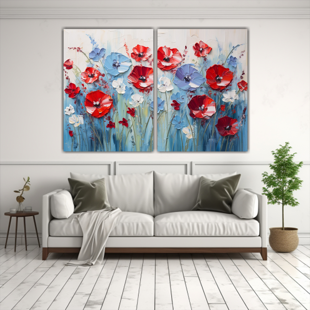 Este cuadro abstracto de flores en rojo y azul se verá espectacular en tu sala de estar sobre un sofá de tonos neutros, creando un contraste vibrante y sofisticado También puede ser el punto focal en un pasillo amplio para darle calidez y color ¡Atrévete a destacar tu estilo con esta obra de arte!