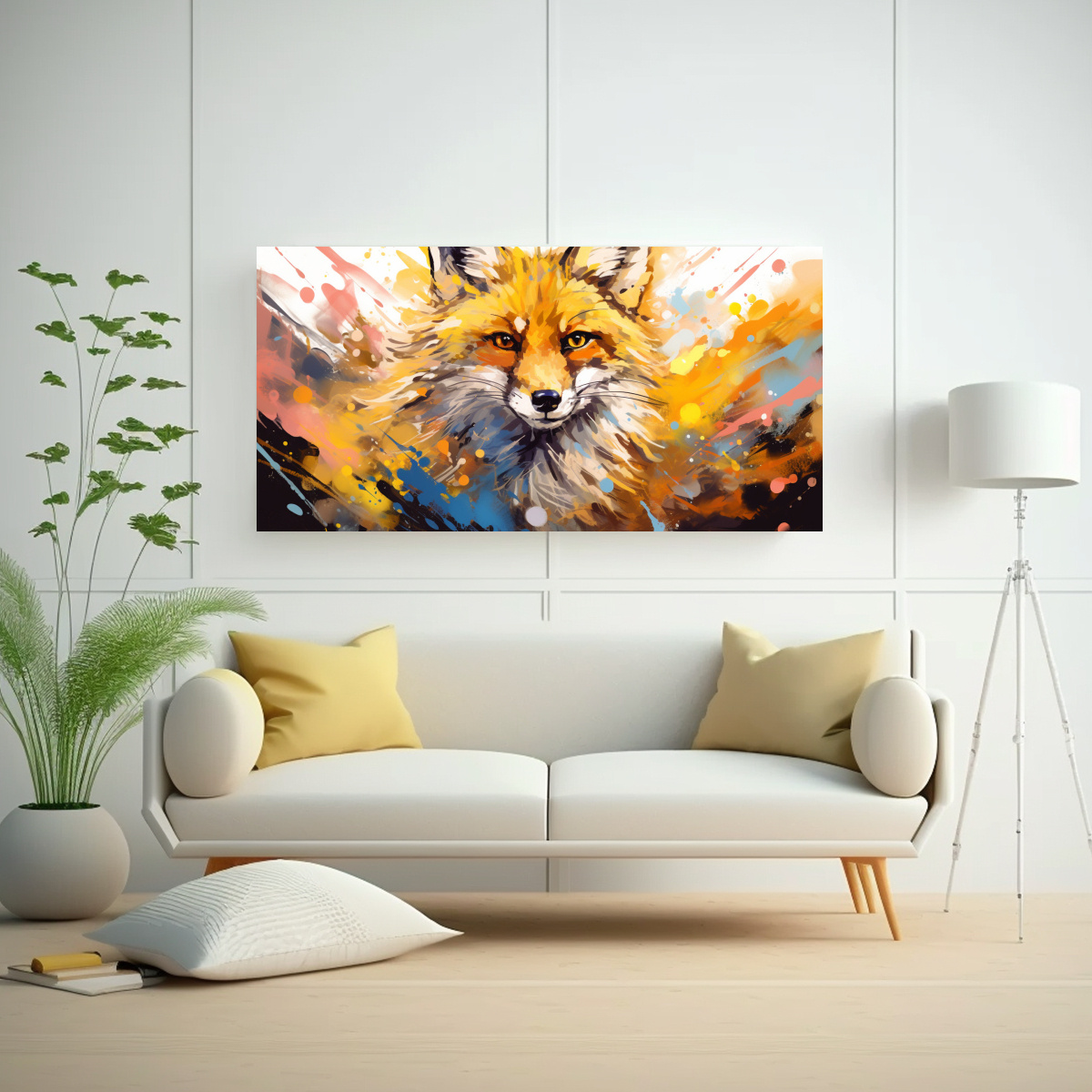 Para realzar la belleza del cuadro Zorro en colores claros y canarios, te recomendamos colocarlo en el centro de una pared blanca para que resalte su diseño y los colores vibrantes Combínalo con muebles en tonos neutros y accesorios en verde azulado para crear un ambiente armonioso y moderno en tu sala de estar o estudio