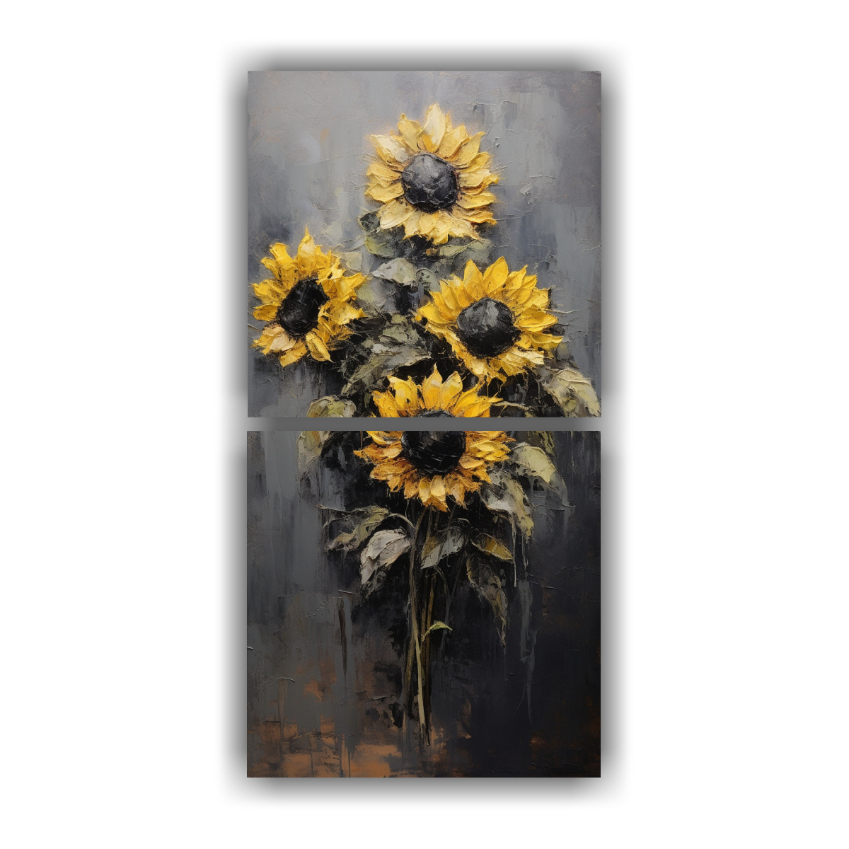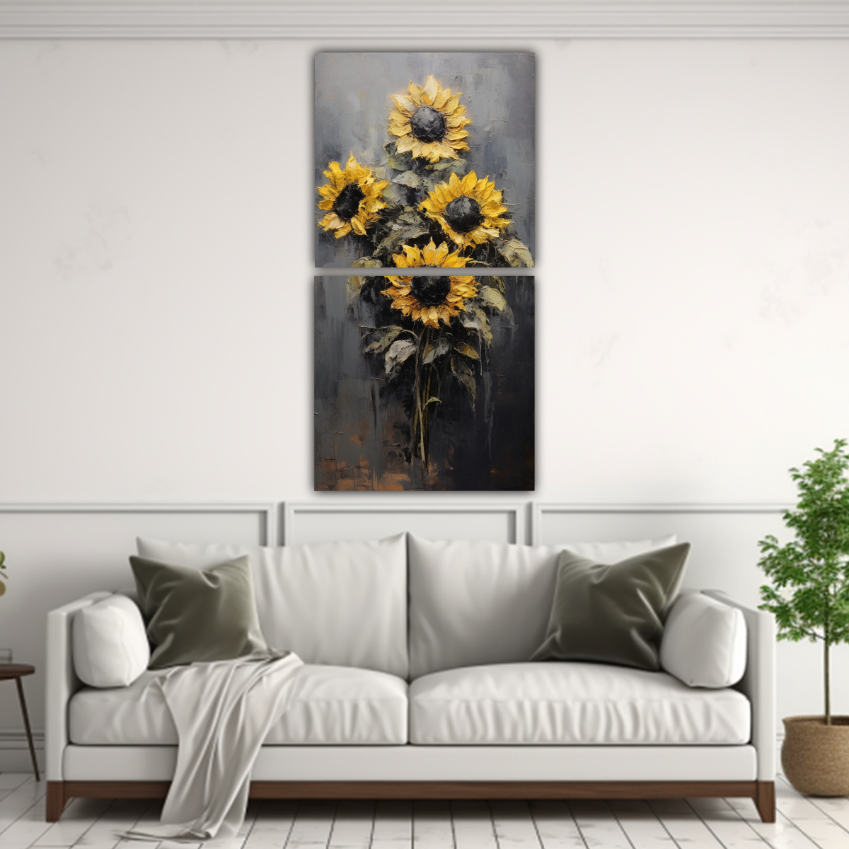 DecoCuadros te ofrece un cuadro de pintura en lienzo de composición equilibrada con girasoles negros en el estilo abstracción Este cuadro está impreso en tela de alta calidad y cuenta con un bastidor de madera resistente Los colores Azul Marino grisaceo, Coral, Gris, Plateado, Dorado y Carmesí se combinan en una obra única y exclusiva de nuestra tienda Además, podrás disfrutar de la mejor calidad del mercado a precios económicos Realizamos entregas rápidas y gratuitas en Santiago, y también ofrecemos envíos express a regiones Decora tu hogar u oficina con este cuadro y crea un ambiente moderno y sofisticado Solo en DecoCuadros encontrarás diseños exclusivos con la garantía de satisfacción