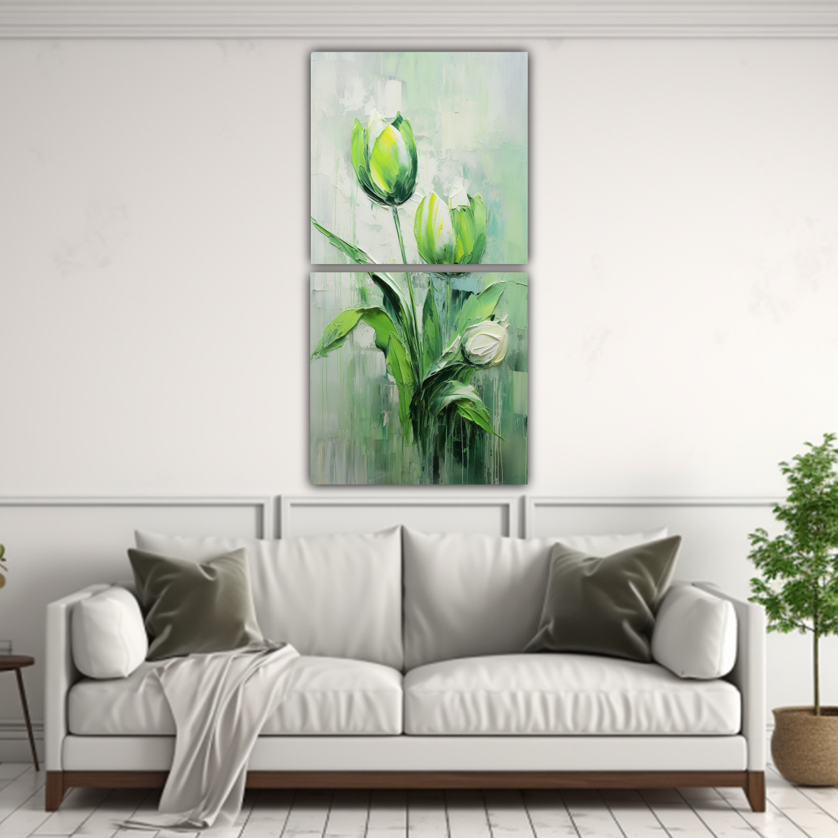 Coloca esta pintura en lienzo de Dos Tonos Mágico a Green TULIPS en tu sala de estar para realzar el ambiente con un toque de elegancia y frescura Combina perfectamente con muebles en tonos grises y plateados