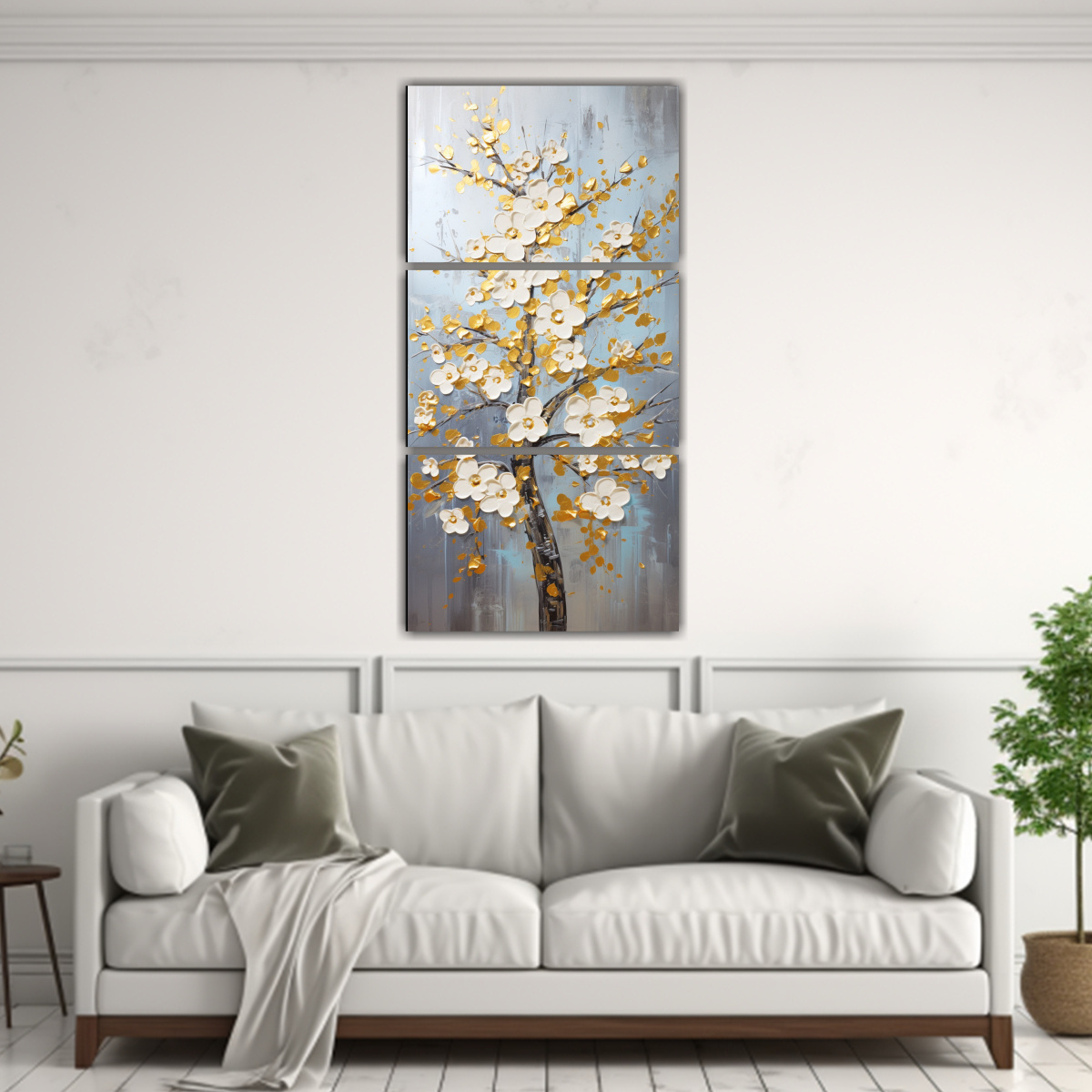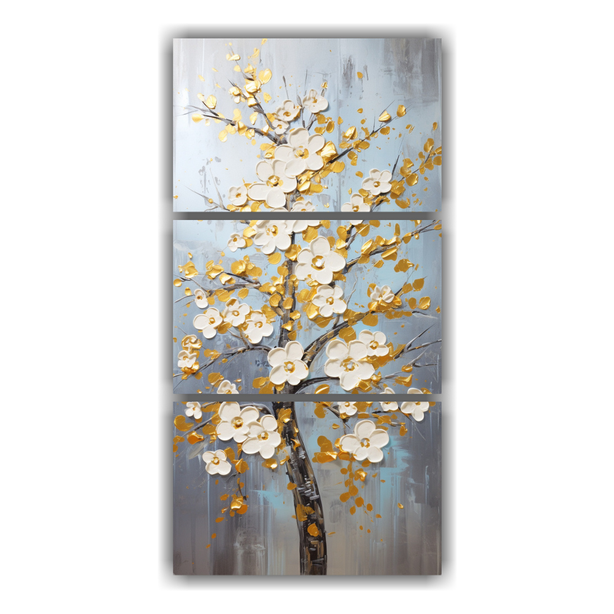 El cuadro de flor de cerezo dorada en lienzo de DecoCuadros es una elegante composición con finas líneas y tonos plateados, dorados, grises y azul marino grisáceo Ideal para darle un toque único y sofisticado a tus espacios Envíos express a regiones disponibles