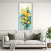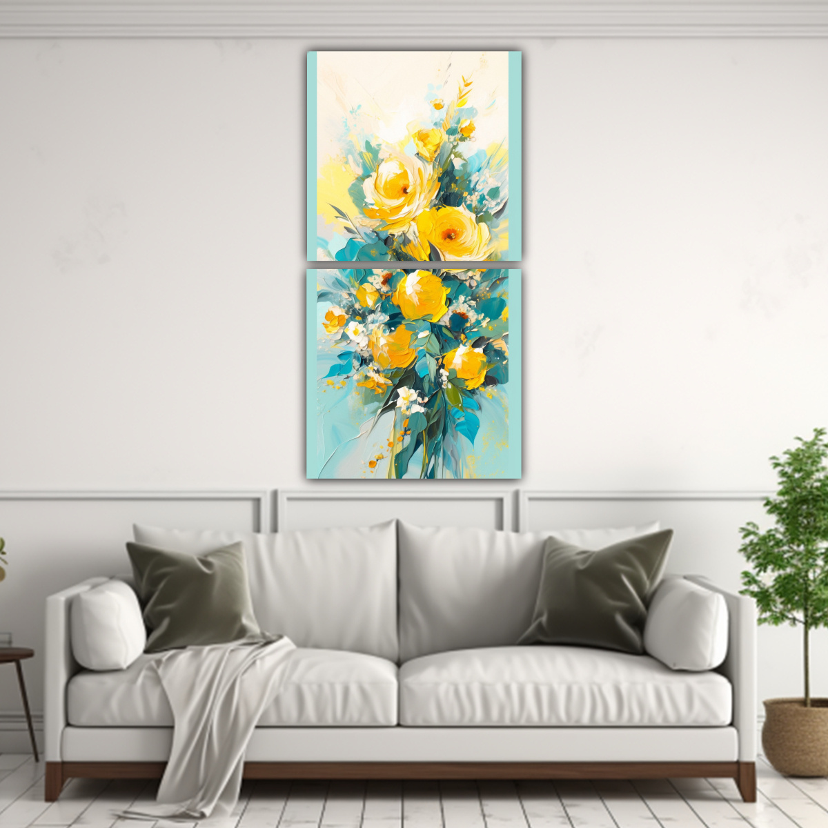 Este cuadro de flores amarillas y azules en movimiento sería ideal para decorar una sala de estar moderna Colócalo en una pared blanca para que los colores resalten aún más Combínalo con cojines en tonos similares y una alfombra turquesa para crear un ambiente fresco y vibrante ¡Deja que este cuadro sea el centro de atención de tu espacio!