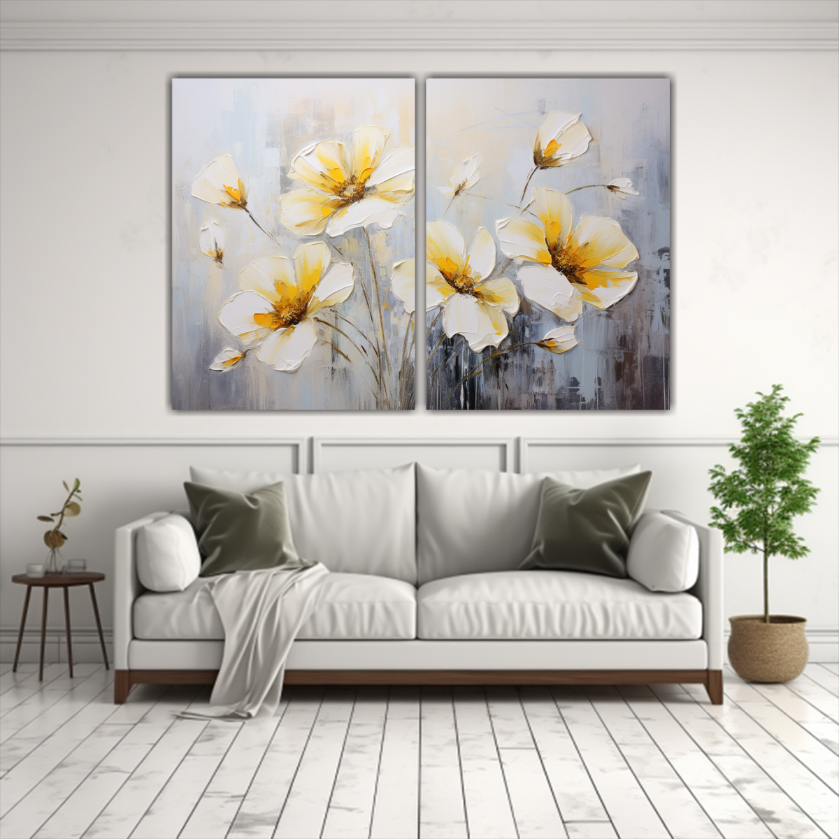 Este cuadro de flores amarillas y blancas en lienzo es ideal para realzar la decoración de tu sala de estar o dormitorio Combínalo con muebles en tonos neutros para crear un ambiente armonioso y lleno de vida ¡Dale un toque de naturaleza a tu hogar!