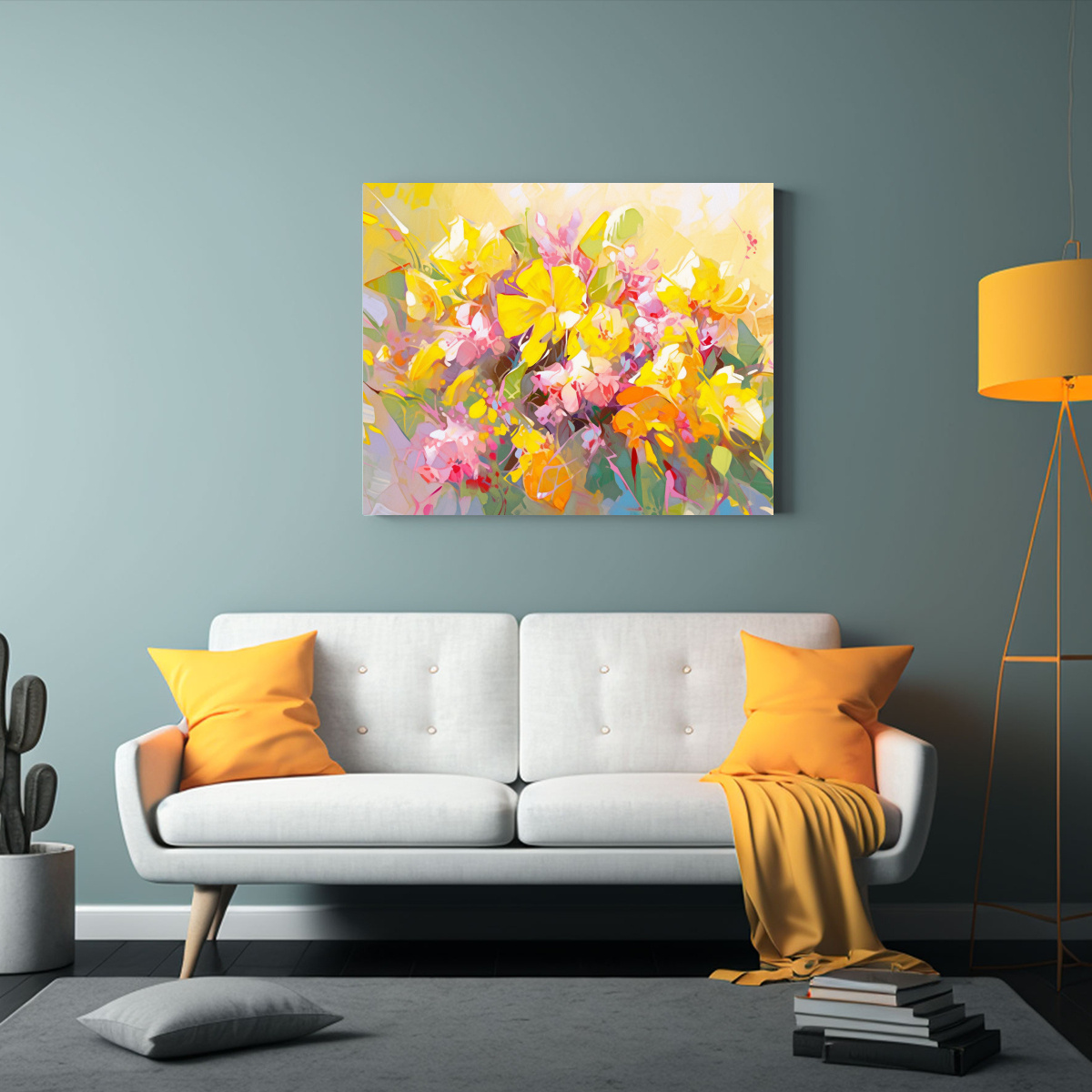 Pintura En Lienzo De Flores Amarillas Y Magentas En Relieve.