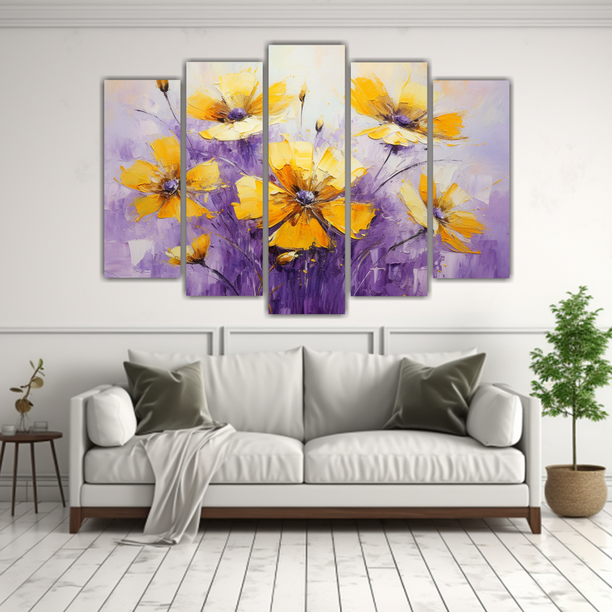 Pintura En Lienzo De Flores Amarillas Y Moradas Para Decoración.
