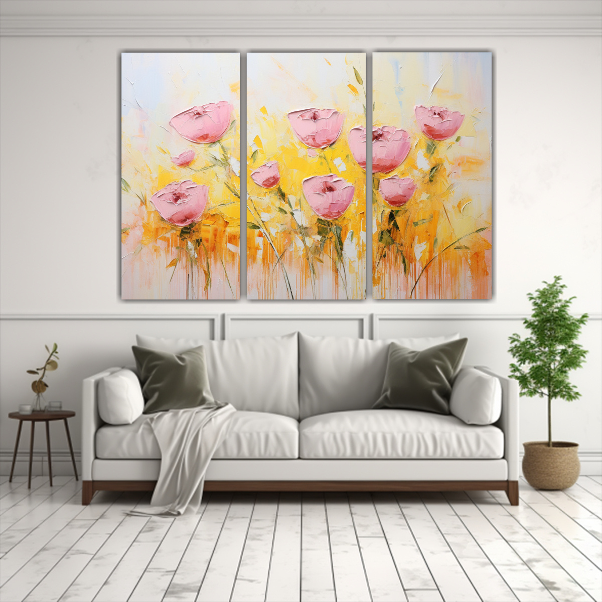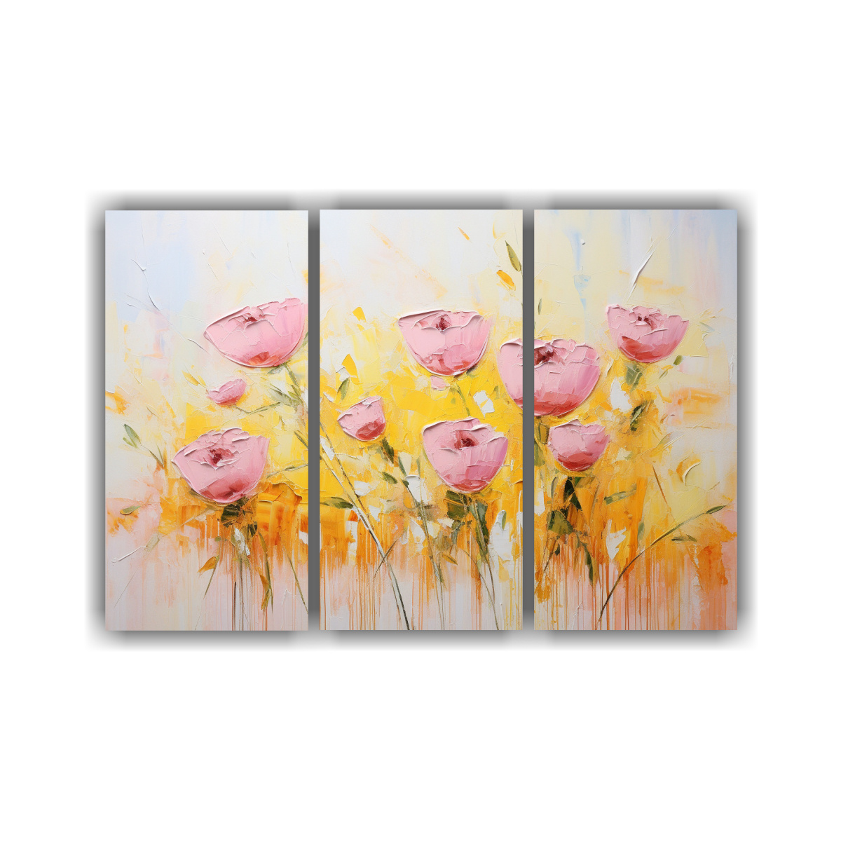 Pintura En Lienzo De Flores Amarillas Y Rosas En Relieve