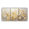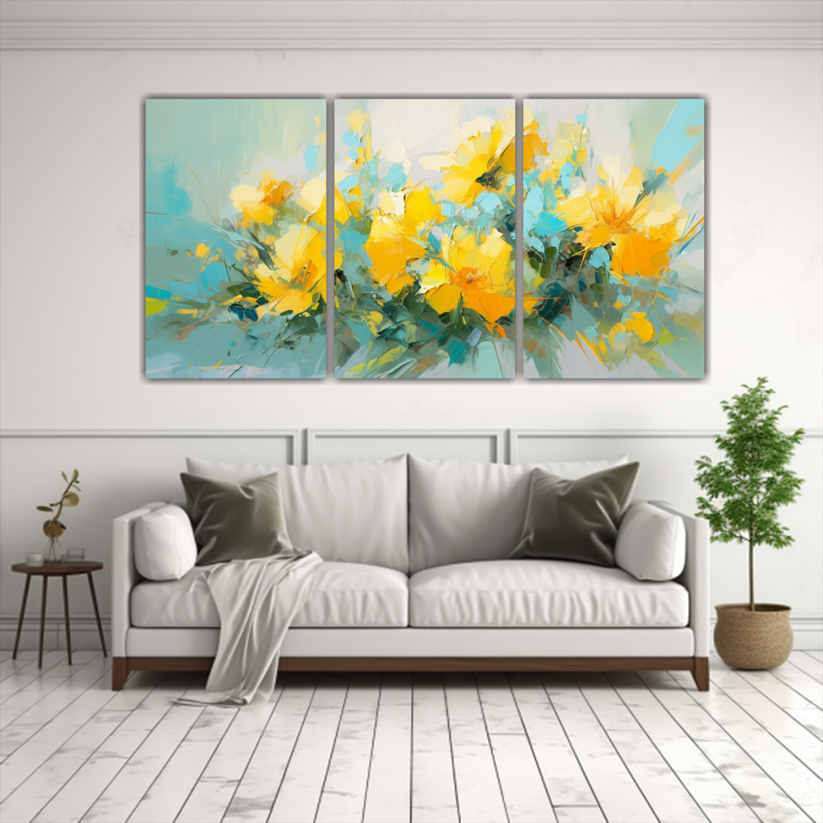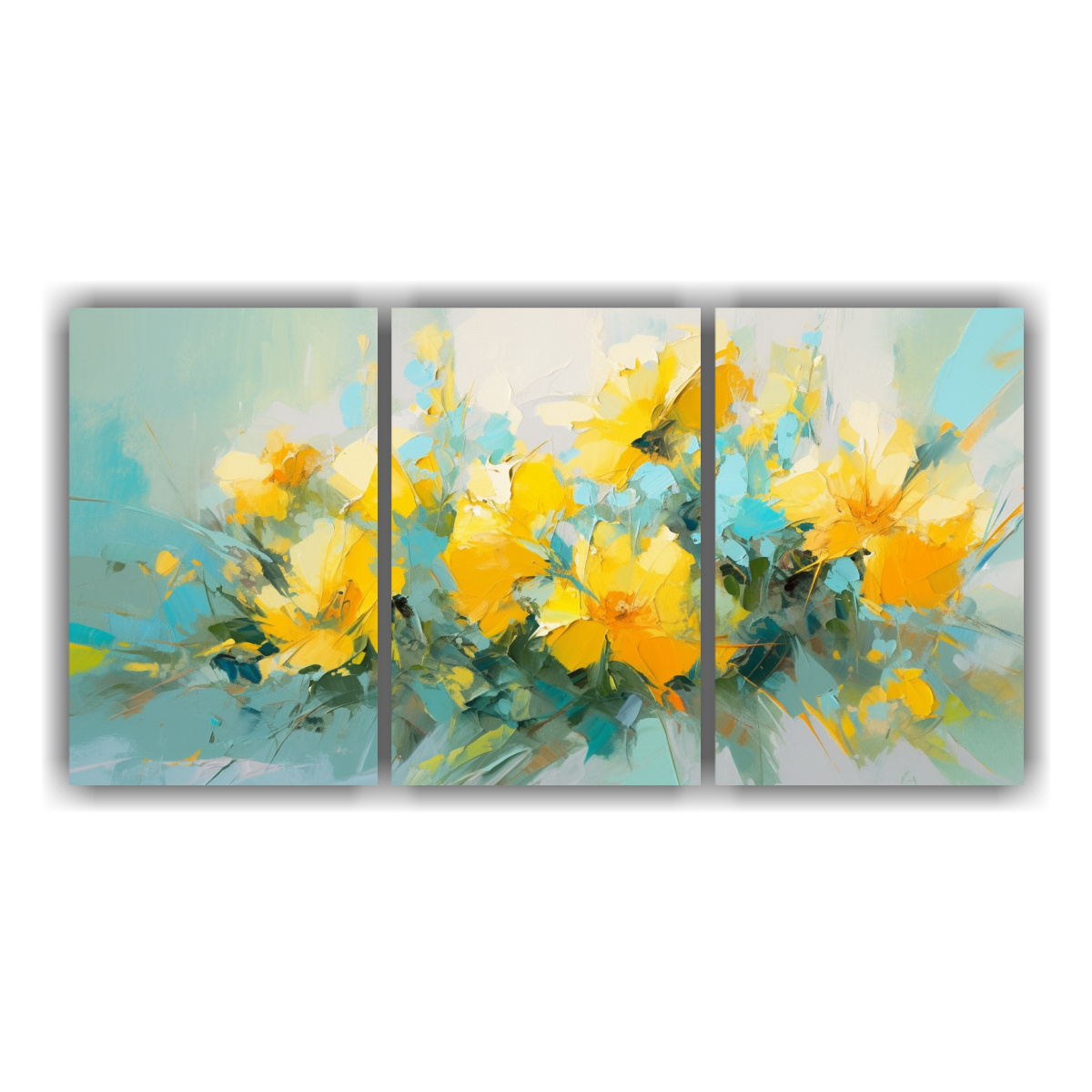 Pintura En Lienzo De Flores Amarillas Y Turquesas Estilo A En Tres Cuadros De Colores