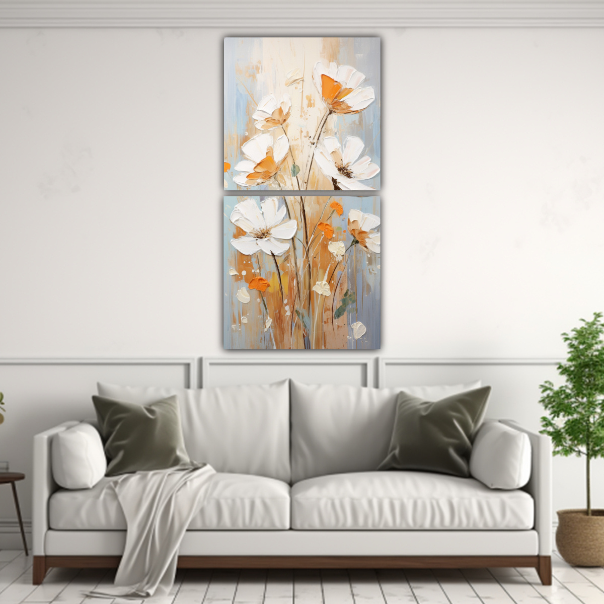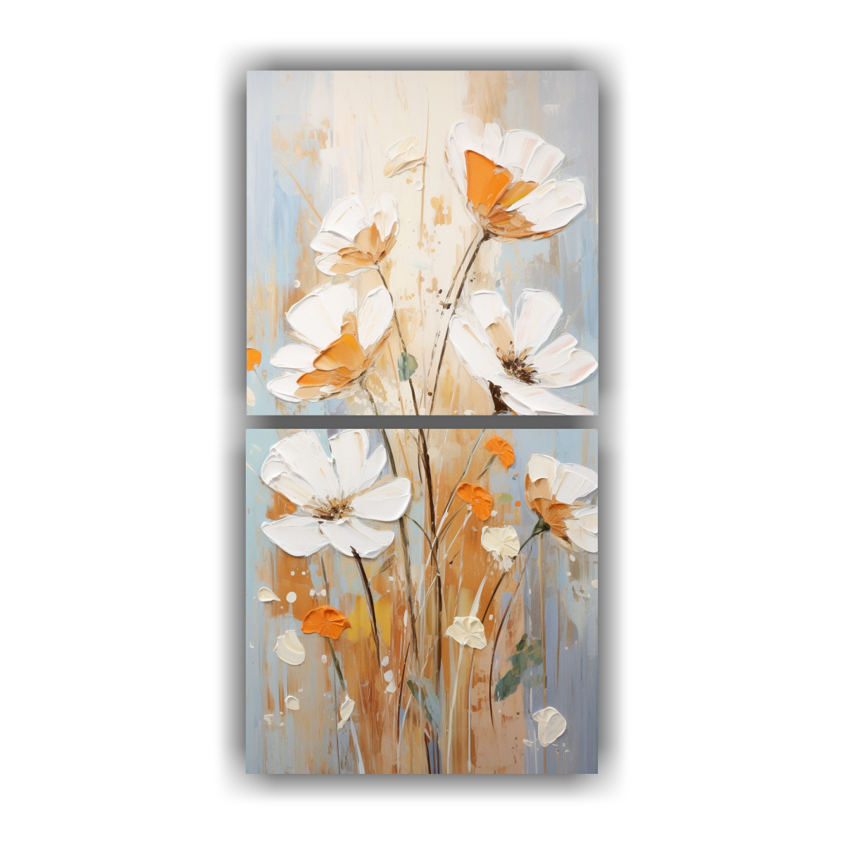 Este cuadro de flores blancas y naranjas se vería espectacular en un salón o comedor Puedes colocarlo sobre una pared de color neutro para que resalte aún más, o combinarlo con detalles decorativos en tonos coral o beige También sería ideal en un dormitorio, creando un ambiente relajante y lleno de vida ¡Deja volar tu imaginación y encuentra el lugar perfecto para lucir esta hermosa obra de arte!