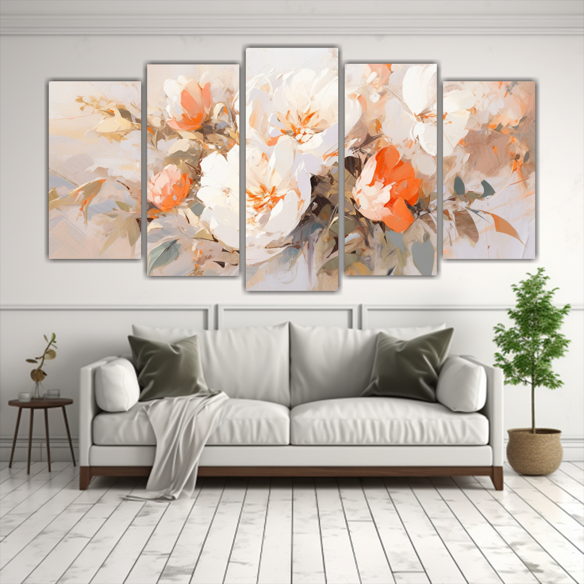 DecoCuadros te ofrece el cuadro de flores blancas y naranjas en t, impresos en tela de alta calidad y montados en bastidores de madera Añade un toque de fantasía a tus decoraciones con esta pintura de colores carmesí, beige, gris y plateado