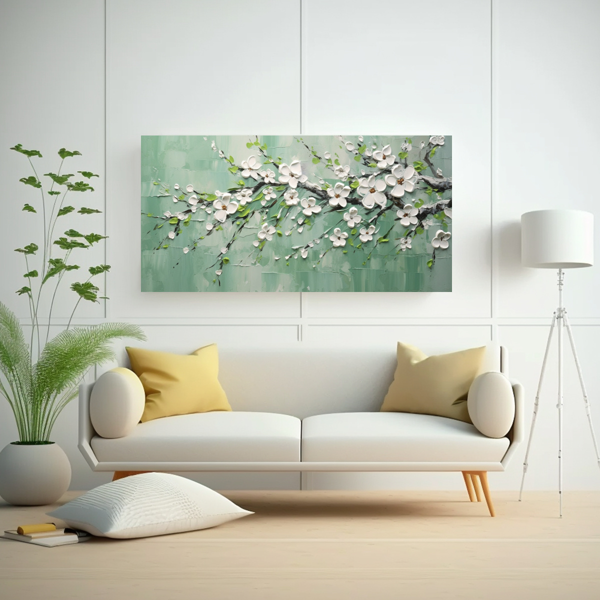 Para realzar la belleza de la Pintura de Flores de Cerezo Verde, colócala en un muro blanco para resaltar sus tonos Combina con muebles en tonos neutros para crear un ambiente armonioso y sofisticado