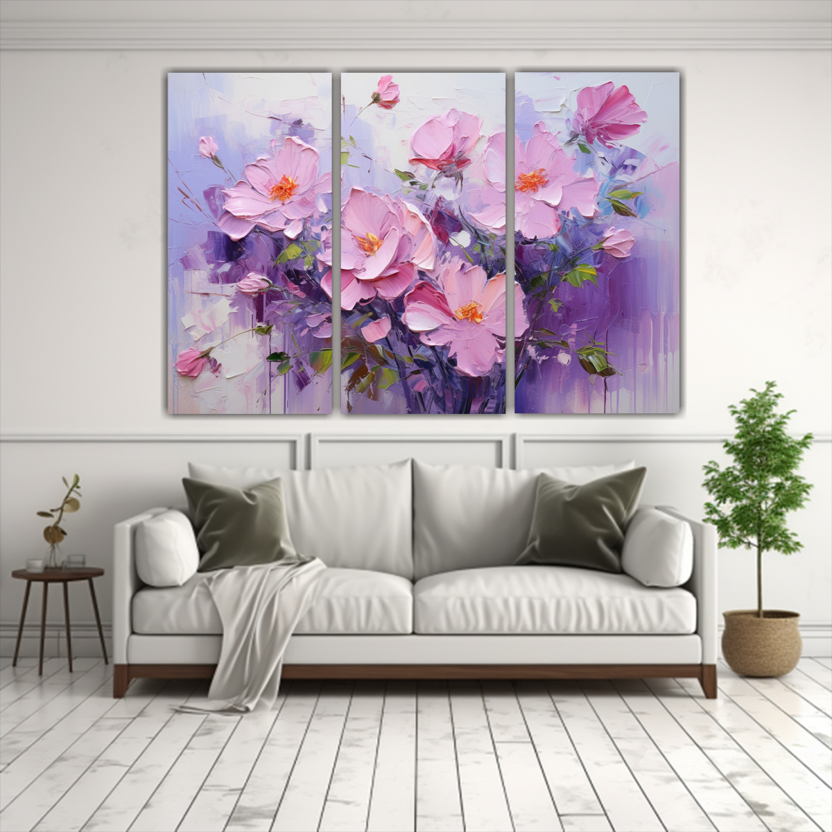 Este cuadro de flores en colores púrpura y rosa sería ideal para colocar en la sala de estar sobre un sofá blanco, creando un contraste elegante y aportando un toque de frescura primaveral al ambiente Combínalo con cojines en tonos grises y rosados para una decoración armoniosa