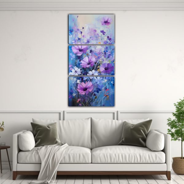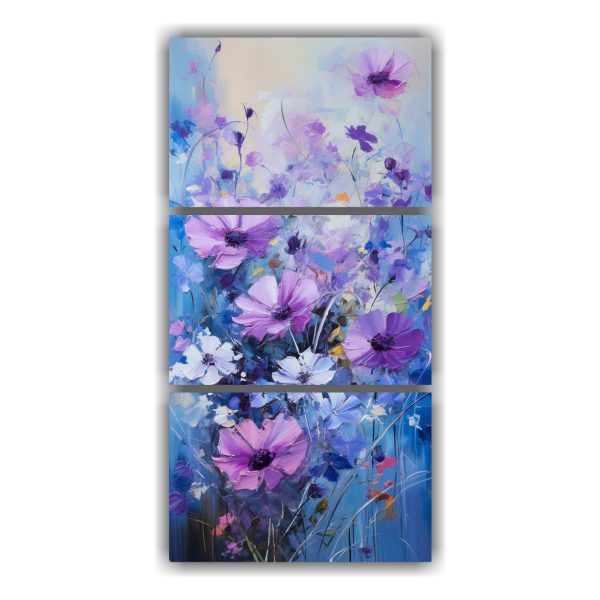 Cuadro de flores moradas y azules en bastidor, con tonos de azul marino grisáceo, plateado, gris, violeta, beige y turquesa Perfecto para darle un toque de elegancia a tu hogar ¡No te pierdas esta oportunidad!