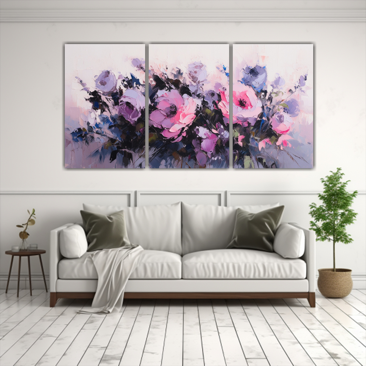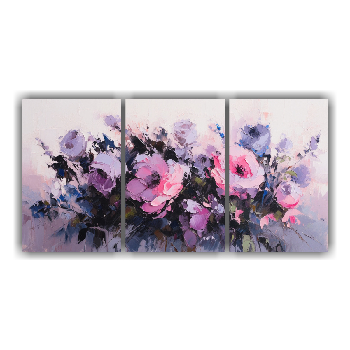Este cuadro de flores púrpuras y rosas en bastidor espectacular se vería ideal en una sala de estar con una decoración moderna Puedes colocarlo sobre un sofá gris para resaltar su belleza y combinarlo con cojines en tonos lila y verde azulado También puedes complementarlo con una alfombra beige y una mesa de centro en color turquesa ¡Así crearás un ambiente cálido y sofisticado!