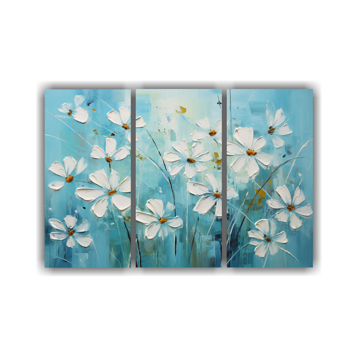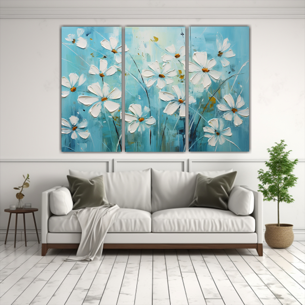 Pintura En Lienzo De Flores Turquesa En Exhibición De Diseño: Tres Cuadros.