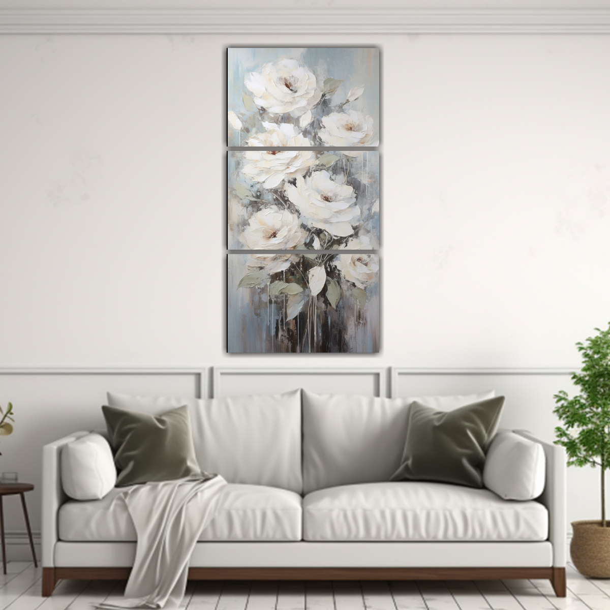 Este cuadro de Rosas Blancas en lienzo queda perfecto en la sala de estar sobre un sofá de color neutro, creando un punto focal elegante Combínalo con cojines en tonos suaves y una alfombra beige para una decoración armoniosa y sofisticada