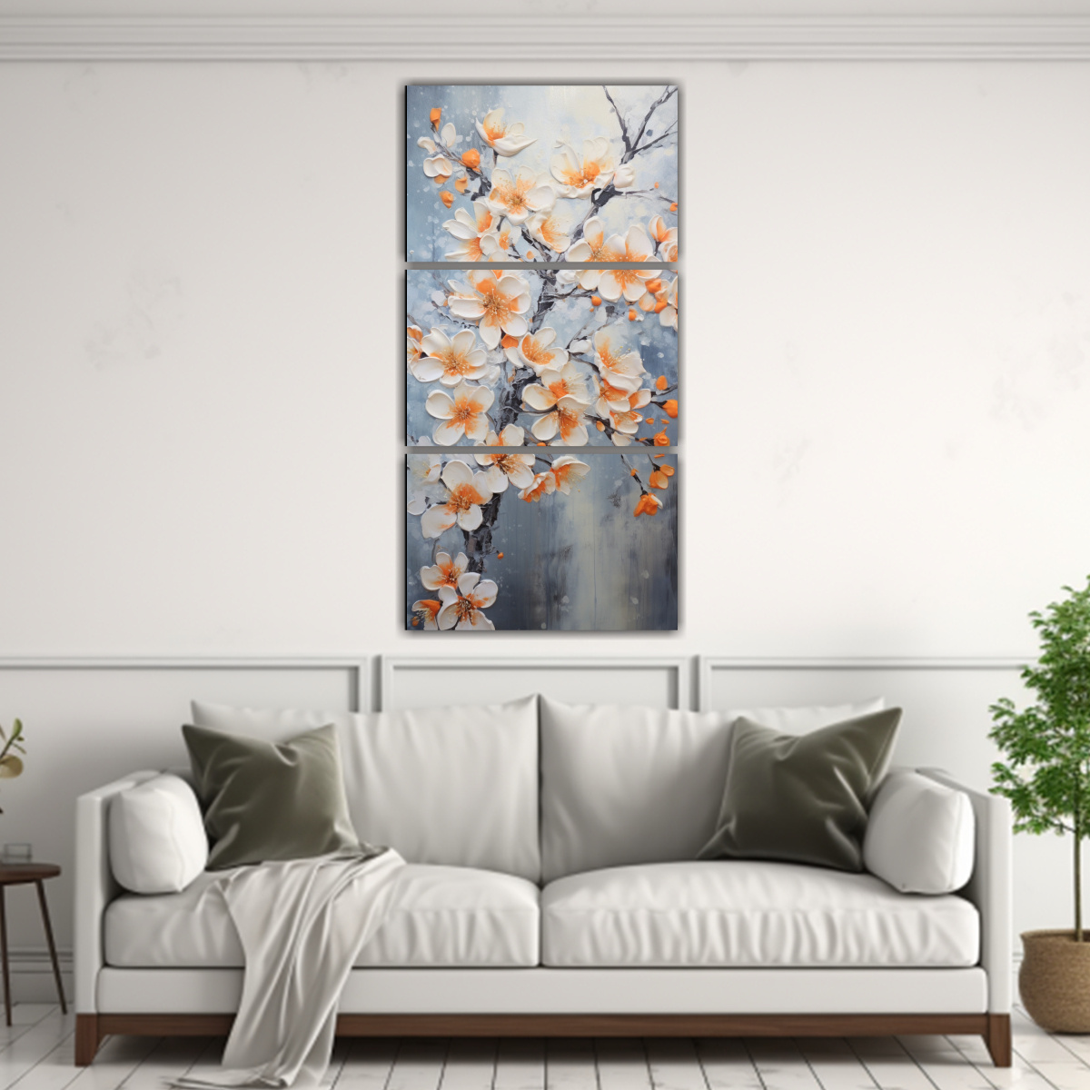 Renueva tu espacio con esta pintura en lienzo de flores de cerezo naranja que aporta vitalidad y elegancia Los colores plateado, gris, azul marino grisaceo, coral, beige combinan perfectamente para dar un toque único a tu decoración