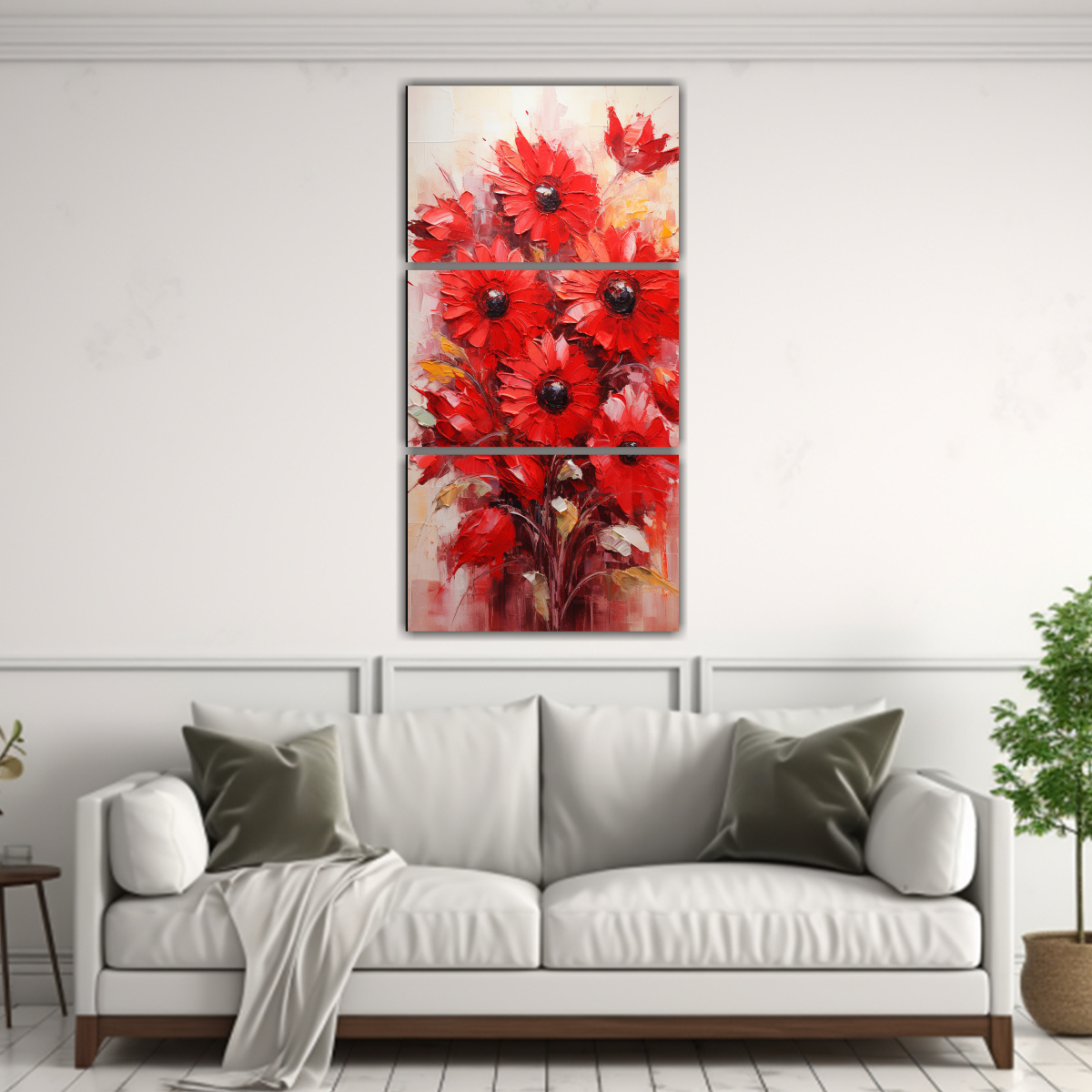 Pintura En Lienzo Estilo Abstracto De Tres Lienzos Con Profundidad Y Girasoles Rojos