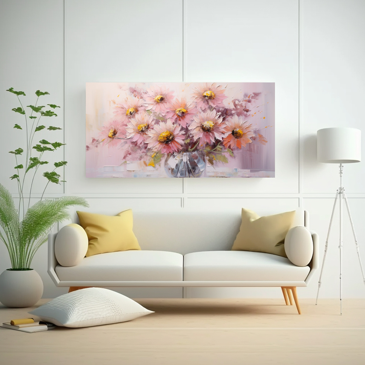 Puedes colocar este cuadro en el salón principal de tu hogar, combinando colores claros como el beige y el coral para crear un ambiente cálido y acogedor También puedes colocarlo en una oficina o sala de estar para añadir un toque de sofisticación ¡Elige este cuadro de girasoles rosados en lienzo y transforma cualquier espacio!