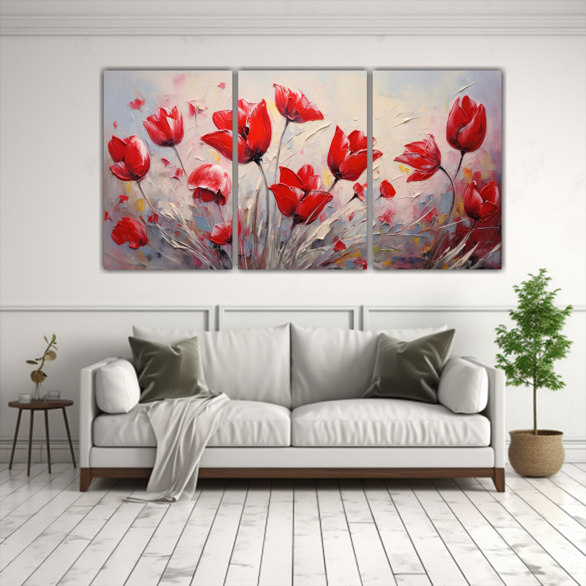 Decora tu hogar con este elegante cuadro tríptico de tulipanes rojos en lienzo de alta calidad Diseño exclusivo y entrega rápida y gratuita en Santiago Colores: Plateado, Azul Marino grisaceo, Carmesí, Dorado, Gris, Beige