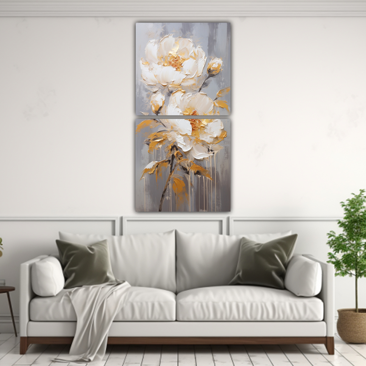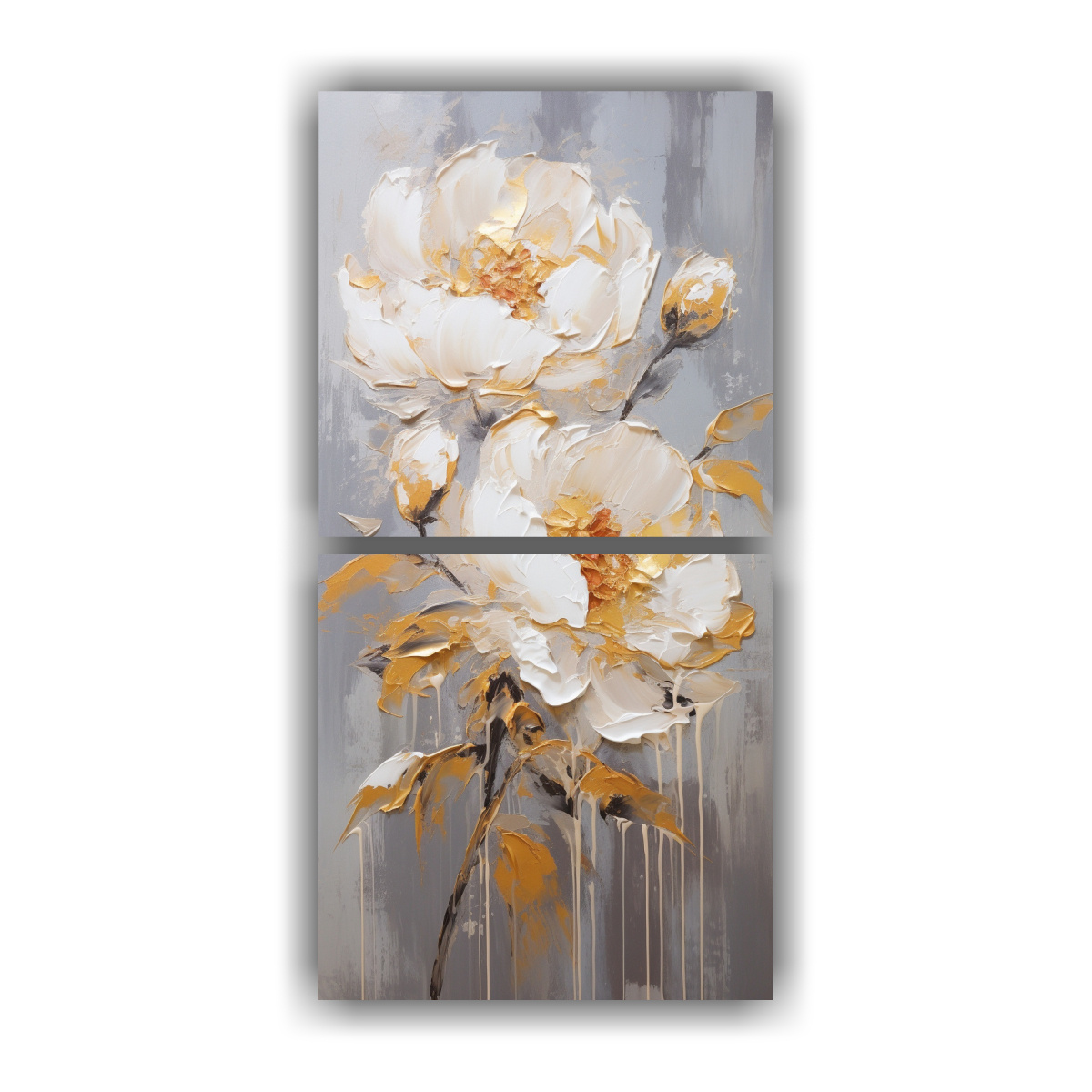 Dos lienzos espectaculares actuales a base de peonías doradas en tonos plateado, beige, dorado, azul marino grisáceo y gris Diseños exclusivos de nuestra tienda y entrega gratuita en Santiago