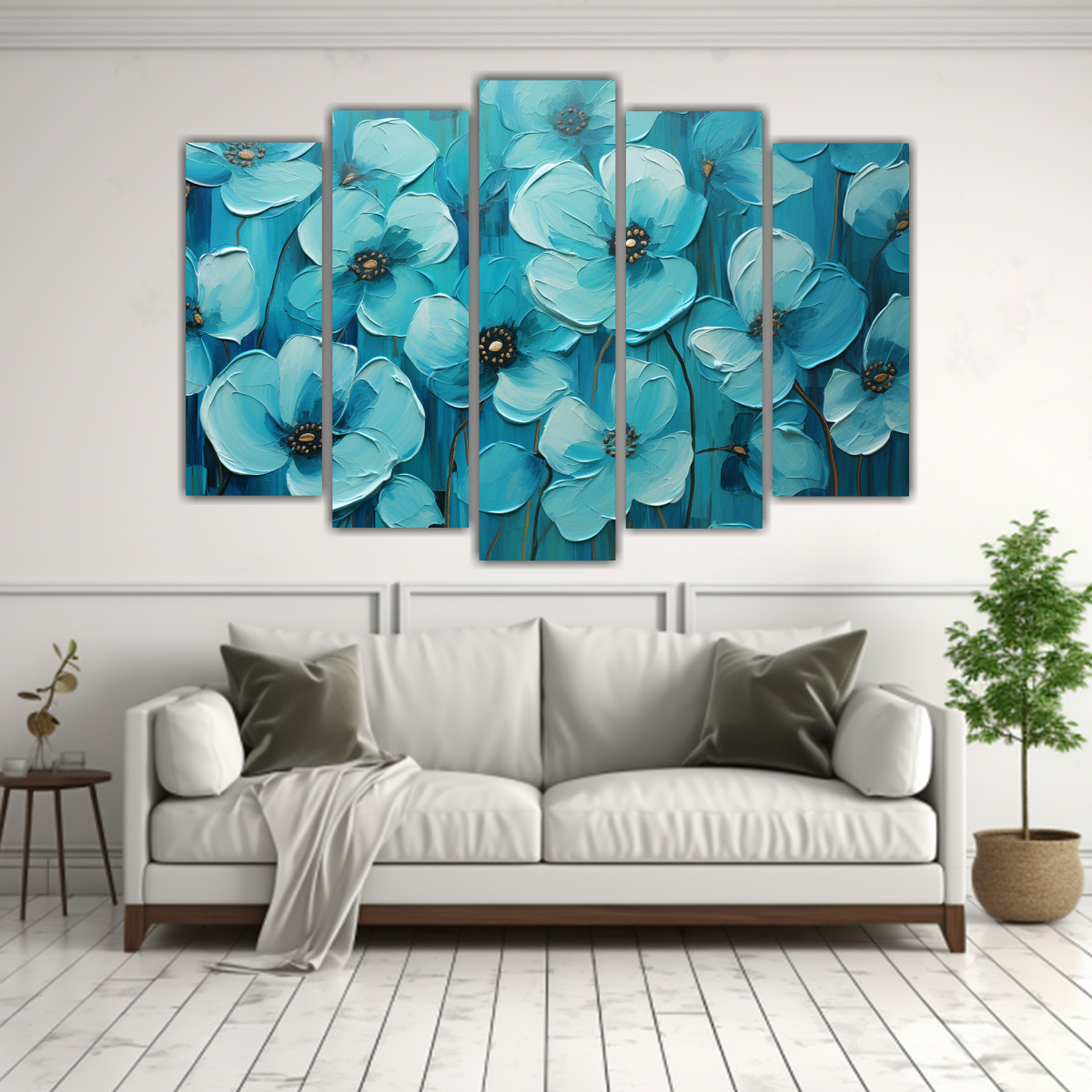 Pintura En Lienzo Estilo Florido En Tonos Azul Verdoso Para Decoración Del Hogar