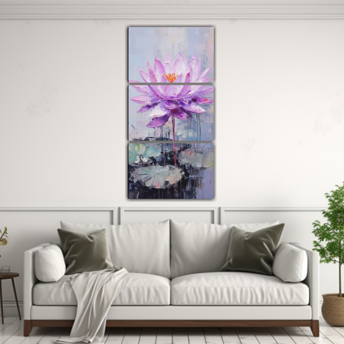 Coloca este cuadro en el centro de tu sala de estar para crear un punto focal impresionante Combínalo con muebles en tonos neutros para resaltar su belleza y añadir un toque de color a la decoración ¡Transforma tu espacio con este hermoso contraste de loto púrpura!