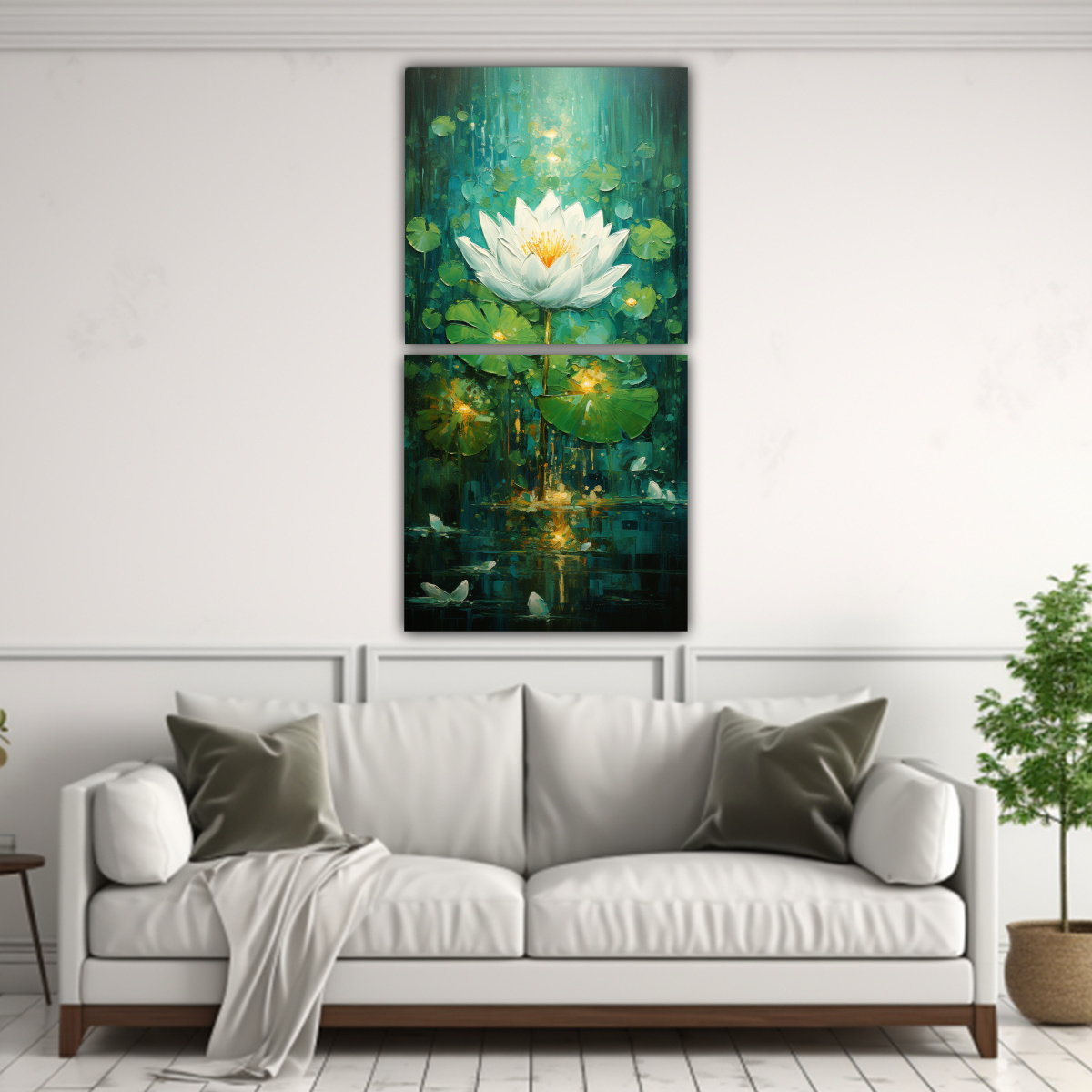 Este cuadro de movimiento estético de flor de loto verde quedará perfecto en tu sala de estar, especialmente si tienes una decoración en tonos neutros Colócalo sobre un sofá en tono gris claro y combínalo con cojines en colores plateados y turquesas para crear una atmósfera relajante y sofisticada También puedes colocarlo en tu dormitorio, sobre la cabecera de la cama, rodeado de cuadros en tonos menta, mostaza y verde azulado para crear un ambiente acogedor y lleno de vida