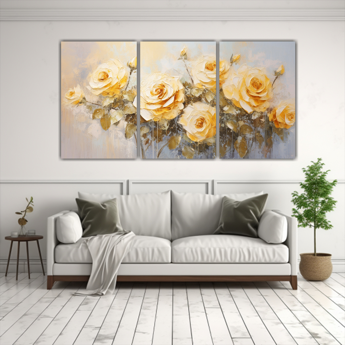 Pintura En Lienzo Estilo Tríptico Combinación De Rosas Amarillas En Diseño.