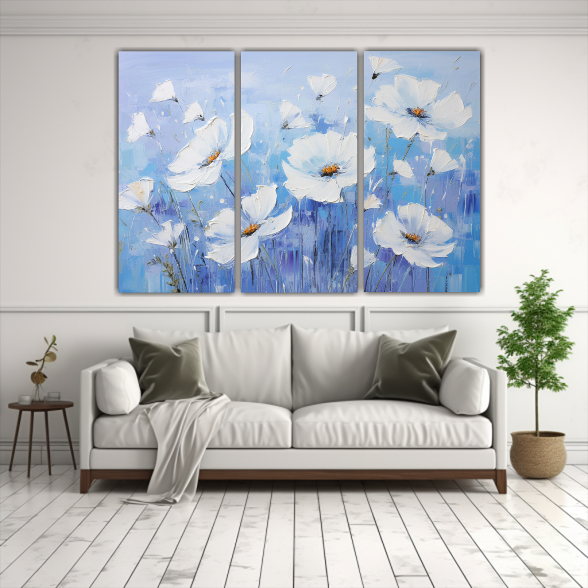 Pintura En Lienzo: Flores Blancas Y Azules En Concepto De Simplicidad