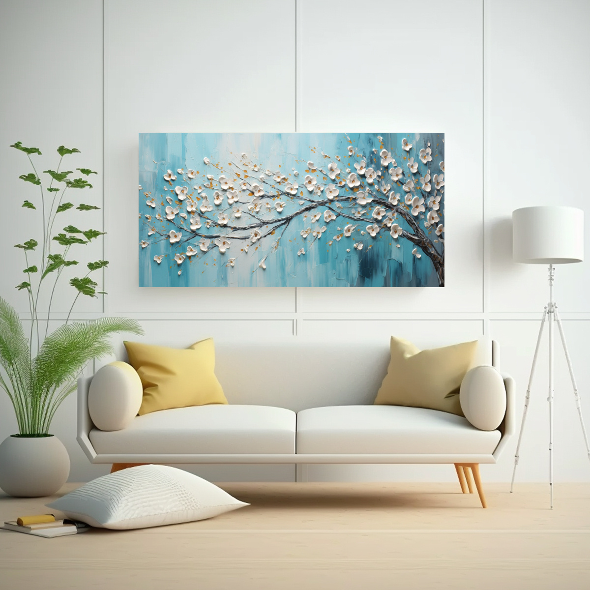 Este cuadro de flores de cerezo turquesa se vería increíble en la sala de estar, sobre un sofá de color neutro Su diseño moderno y los tonos plateado y gris complementarán la decoración de cualquier ambiente ¡Agrega un toque de fantasía a tus espacios con este cuadro exclusivo de DecoCuadros!
