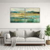 Pintura En Tela Abstracta Estética Con Acuarela Verde, Turquesa Y Dorado En Decoración De Pared