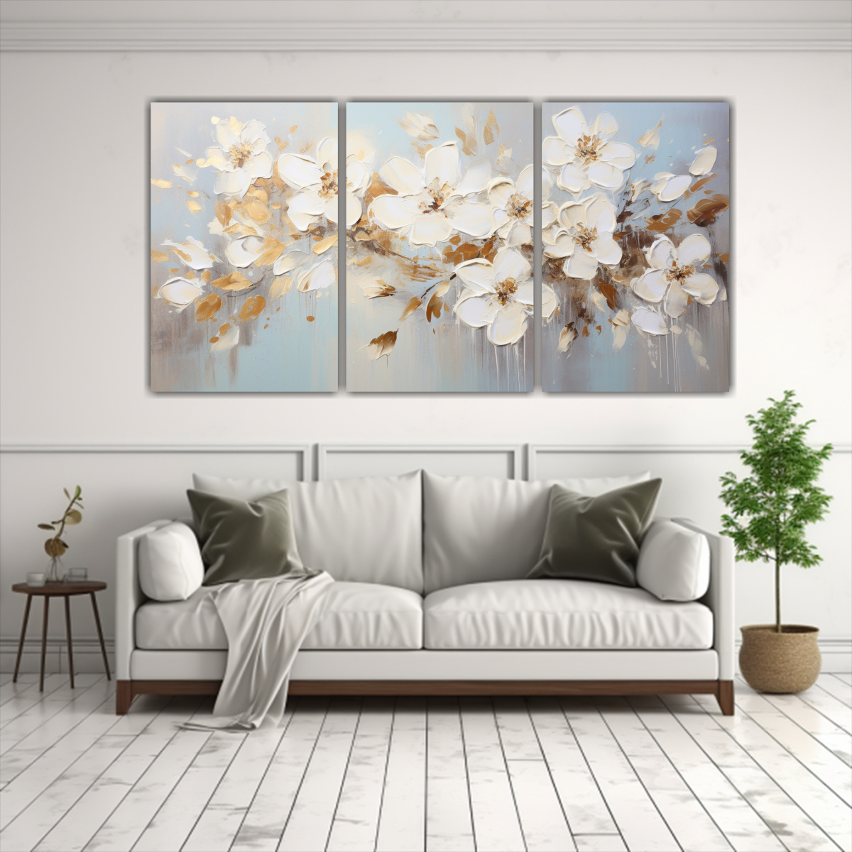 Este cuadro sería perfecto para decorar tu sala de estar Colócalo sobre un sofá gris o beige para resaltar su belleza en tonos blancos y dorados Complementa con cojines en tonos plateados y chocolate para lograr un ambiente elegante y sofisticado