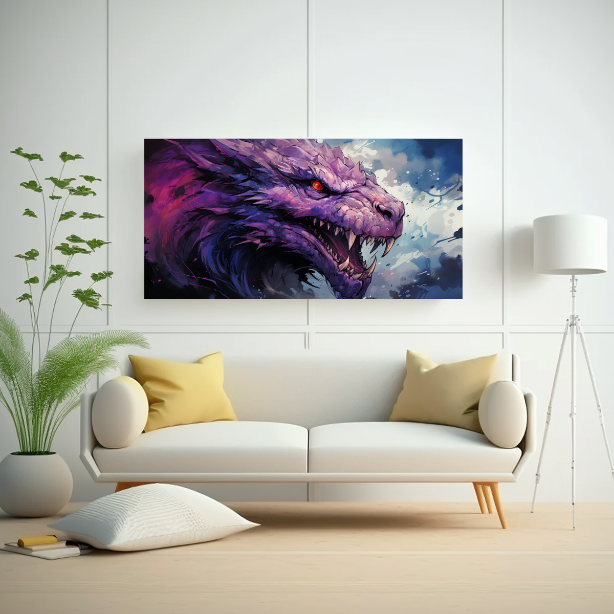 Pintura En Tela Temática De Dragón En Tonos Morado Y Blanco, Estilo Neonoir