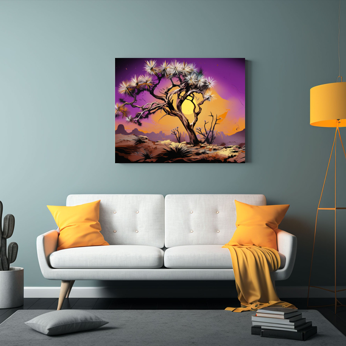 Pintura Espectacular De Arte En Joshua Tree Púrpura Y Dorado, Atmósfera Neonoir