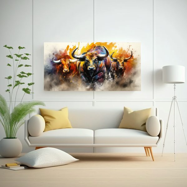 Este cuadro de toros estilo acuarelas coloridas se vería espectacular en la pared principal de tu sala de estar, creando un punto focal impactante Combínalo con muebles en tonos neutros para resaltar su belleza y darle vida a tu espacio