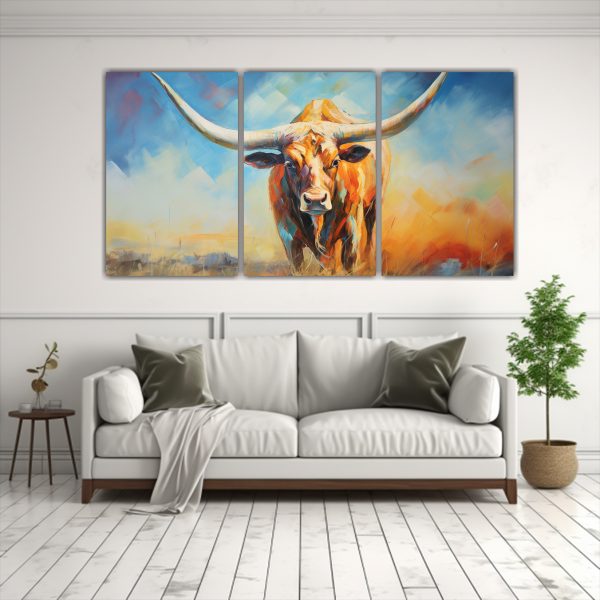 Este cuadro Longhorn en arte de pared se vería perfecto en la sala de estar sobre un sofá de color neutro, creando un contraste elegante y llamativo Combínalo con cojines en tonos azules y grises para una decoración armoniosa y moderna