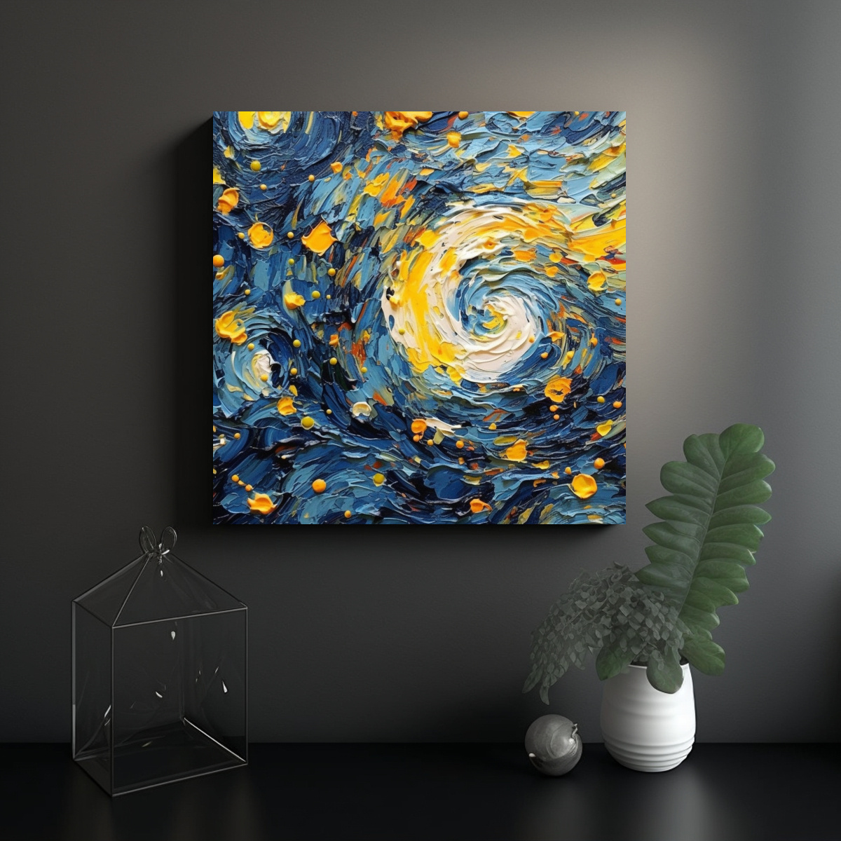 Para realzar la belleza de este cuadro estrella de Van Gogh, te recomendamos colocarlo en el centro de una pared amplia, iluminada por una luz cálida que resalte los tonos azules y plateados Combínalo con muebles en tonos neutros y añade cojines en colores coral y turquesa para lograr un ambiente acogedor y lleno de estilo