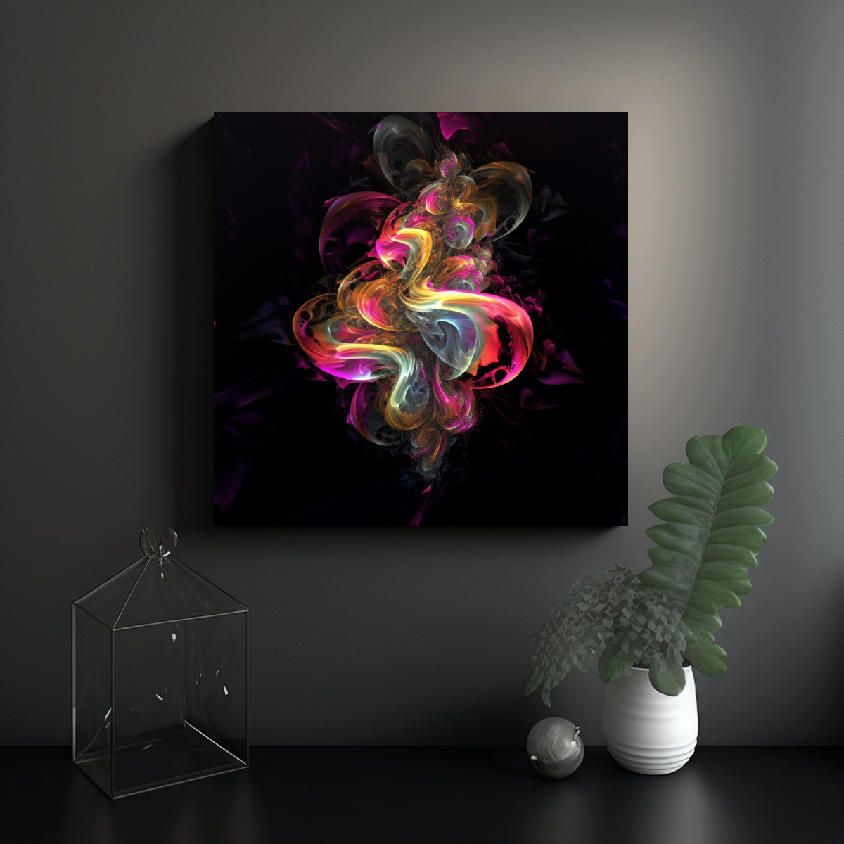 Este cuadro neón rosa y morado giratorio luciría espectacular en una sala de estar moderna, combinando a la perfección con muebles en tonos neutros como blanco y gris Colócalo sobre un sofá de color claro para crear un punto focal llamativo y lleno de energía en tu ambiente