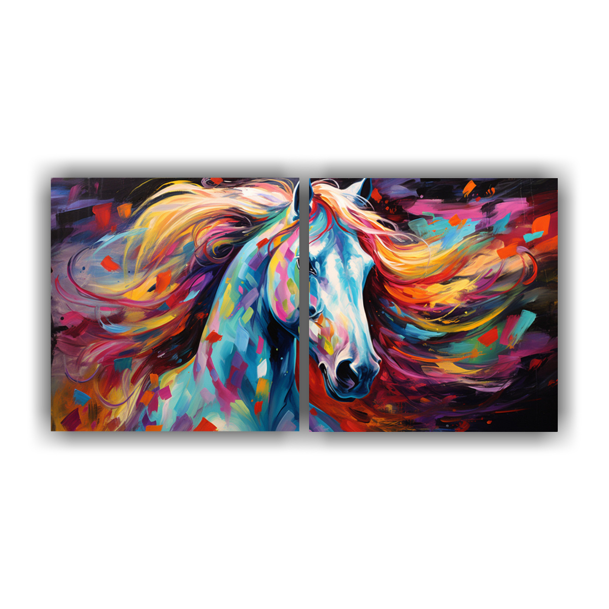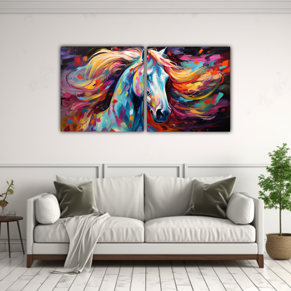 Este cuadro de caballo colorido luciría espectacular en tu sala de estar sobre un sofá de color neutro, creando un punto focal llamativo y elegante Combínalo con cojines en tonos similares para lograr una decoración armoniosa y sofisticada