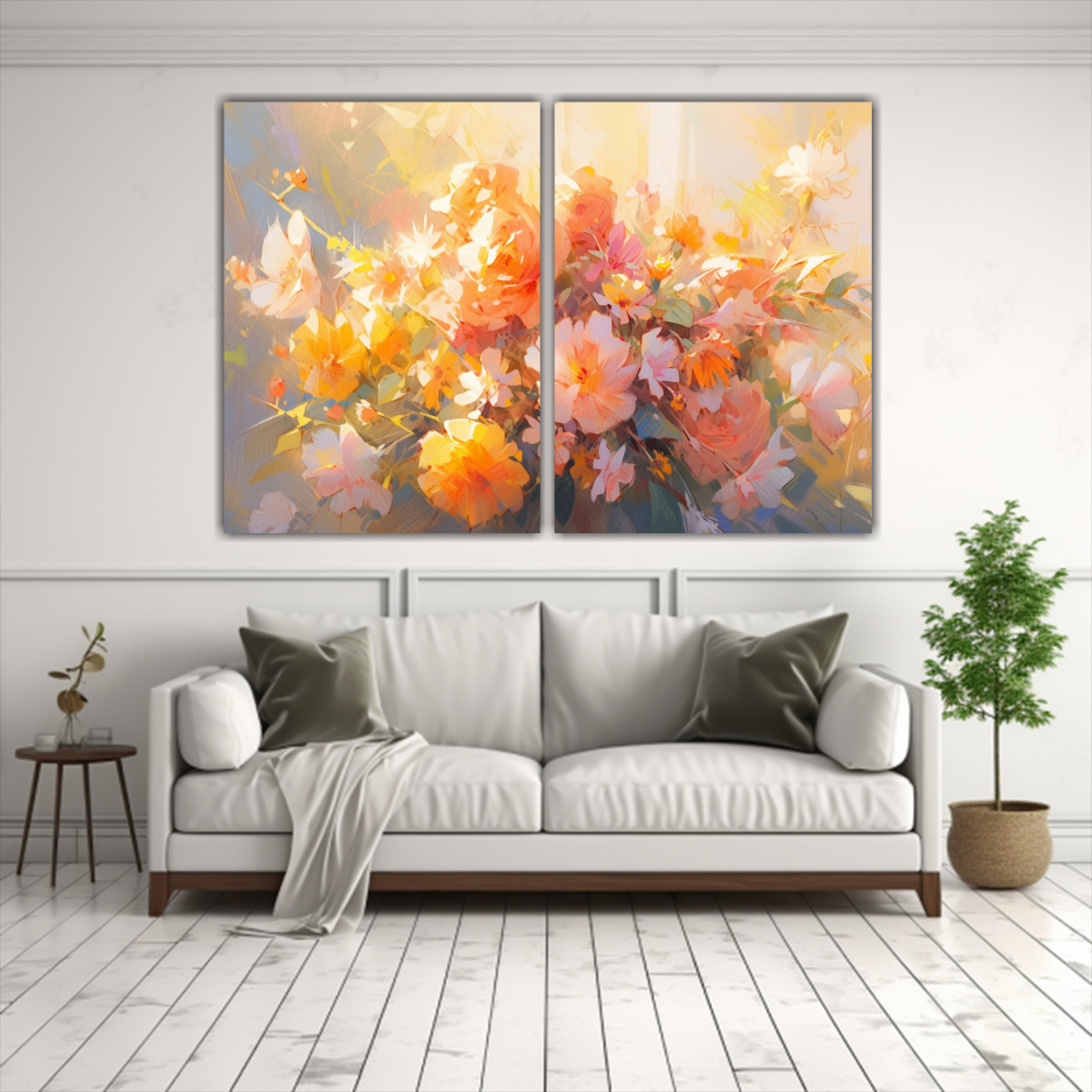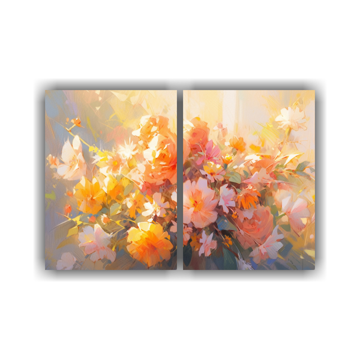 Este díptico de flores amarillas y magenta en lienzo se vería espectacular en un salón amplio con paredes blancas, aportando calidez y color Combínalo con muebles en tonos neutros para resaltar su belleza