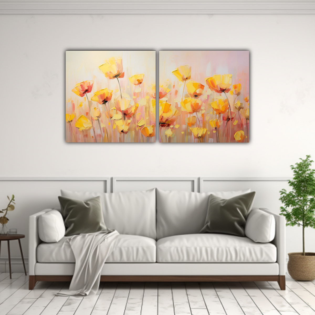 DecoCuadros tiene para ti una pintura floral en lienzo amarillo y rosa de alta calidad Nuestros cuadros están impresos en tela de primera, montados en bastidores de madera y ofrecen una excelente relación calidad-precio Los colores plateado, beige, mostaza, carmesí, gris, azul marino grisáceo, coral y amarillo claro se fusionan para brindar una imagen vibrante y elegante Compra ahora y disfruta de la mejor calidad y los precios más económicos del mercado