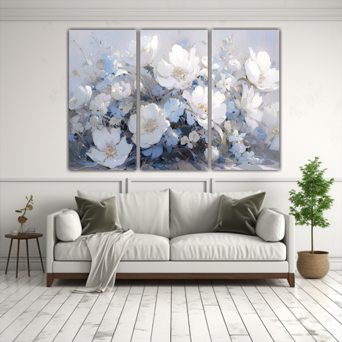 Este cuadro floral en colores blanco y plata sería ideal para decorar un salón elegante o un dormitorio sofisticado Combínalo con muebles en tonos neutros como blanco, gris o beige para resaltar su belleza y darle un toque de frescura a la habitación