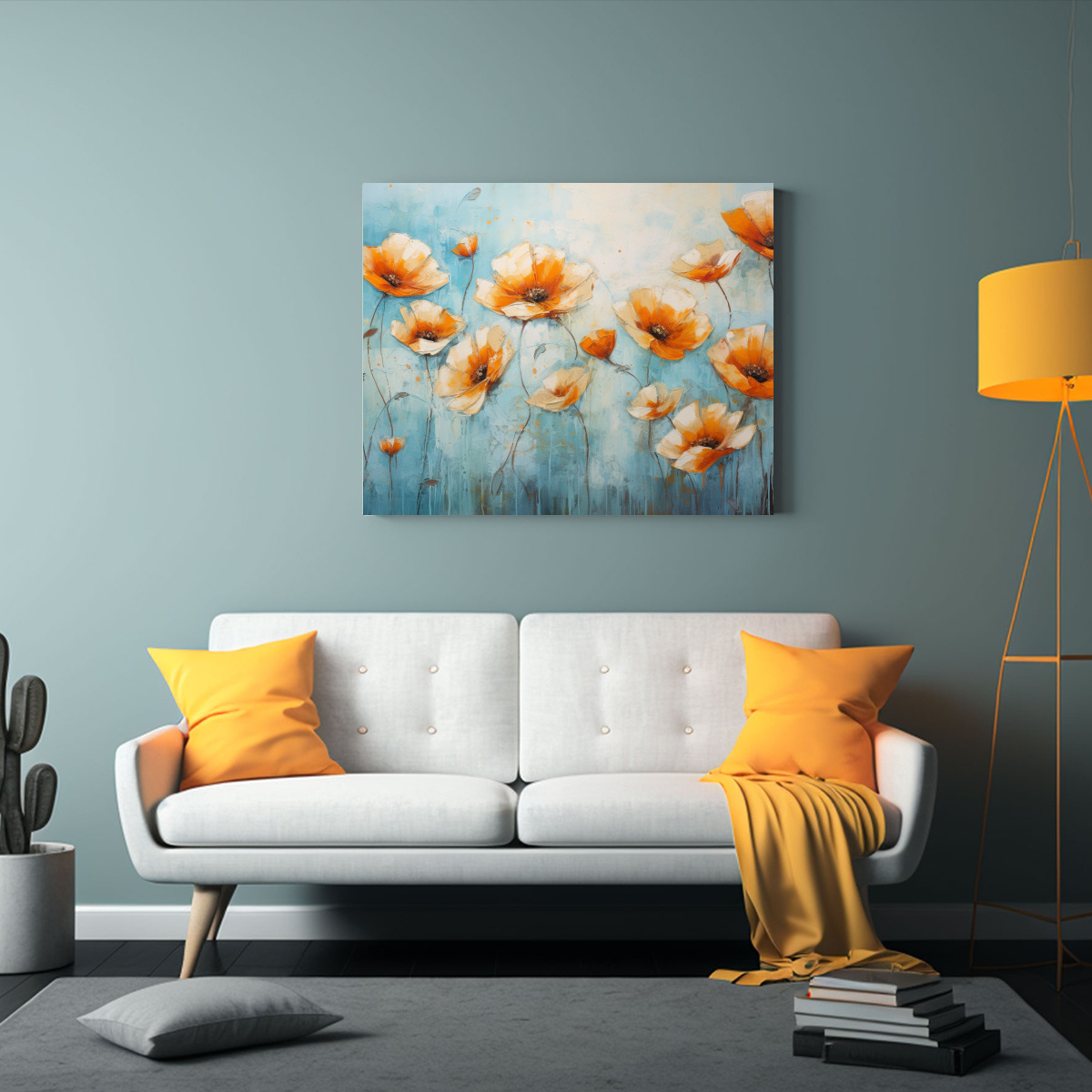 Este cuadro floral en tonos naranja y azul es perfecto para aportar dinamismo y color a tu sala de estar o incluso en la entrada de tu hogar Combínalo con cojines en tonos neutros y elementos decorativos en coral para lograr un ambiente armonioso y lleno de vida
