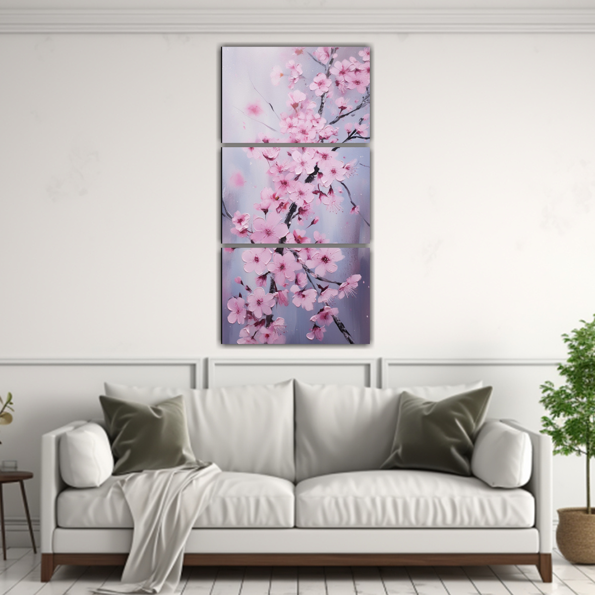 Renueva tu hogar con este conjunto de 3 lienzos acuarela artesanal de cherry blossoms en tonos rosa Combina perfectamente en salas, dormitorios o espacios de relajación Calidad premium a precios accesibles ¡Envíos express a regiones!