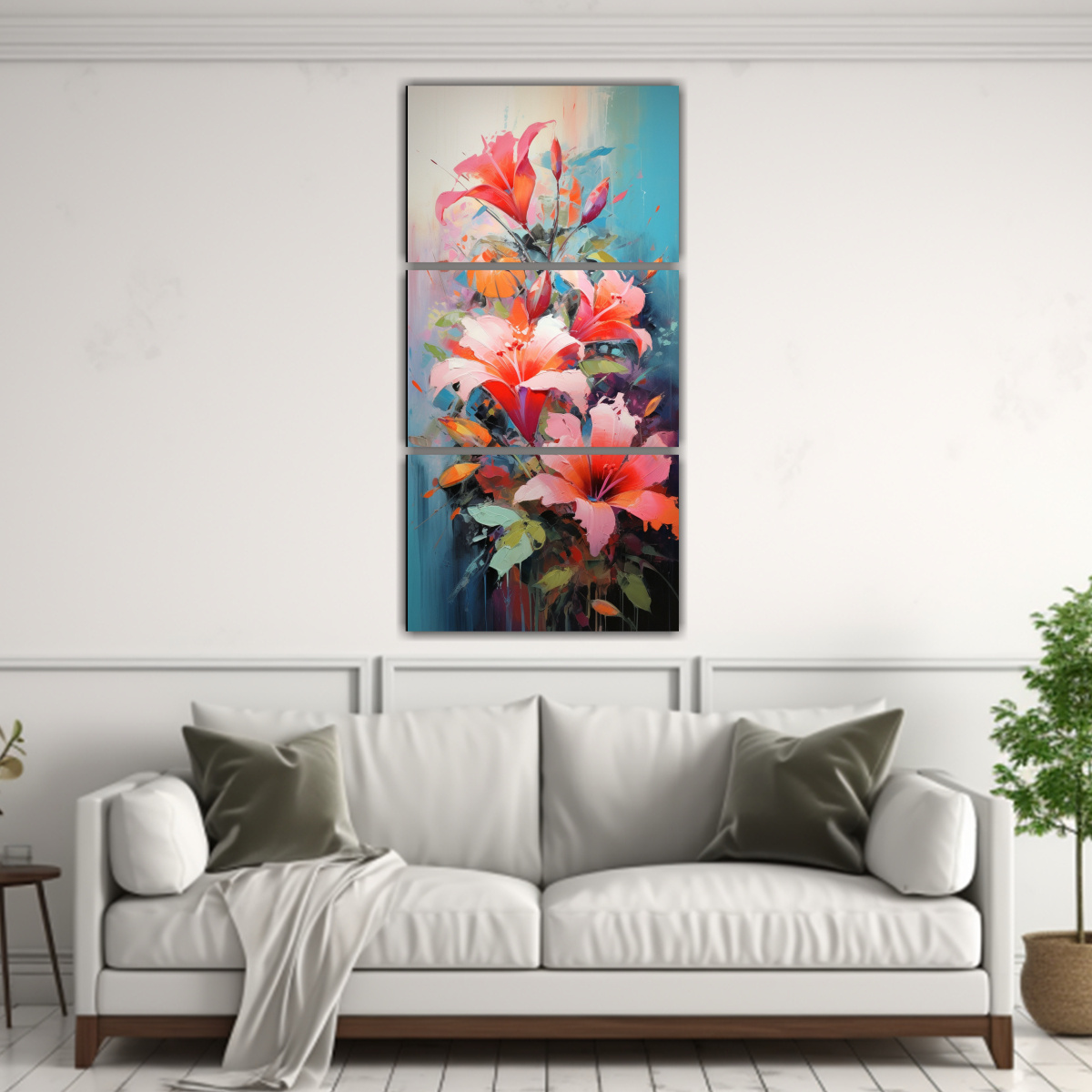 Para decorar con este cuadro floral vibrante en lienzo, te recomendamos colocarlo en el centro de una pared de color blanco para que resalte y sea el punto focal de la habitación Combínalo con cojines en tonos coral, menta y turquesa para lograr una decoración armoniosa y llena de vida ¡Crea un espacio único y acogedor con la intensidad de este cuadro de DecoCuadros!