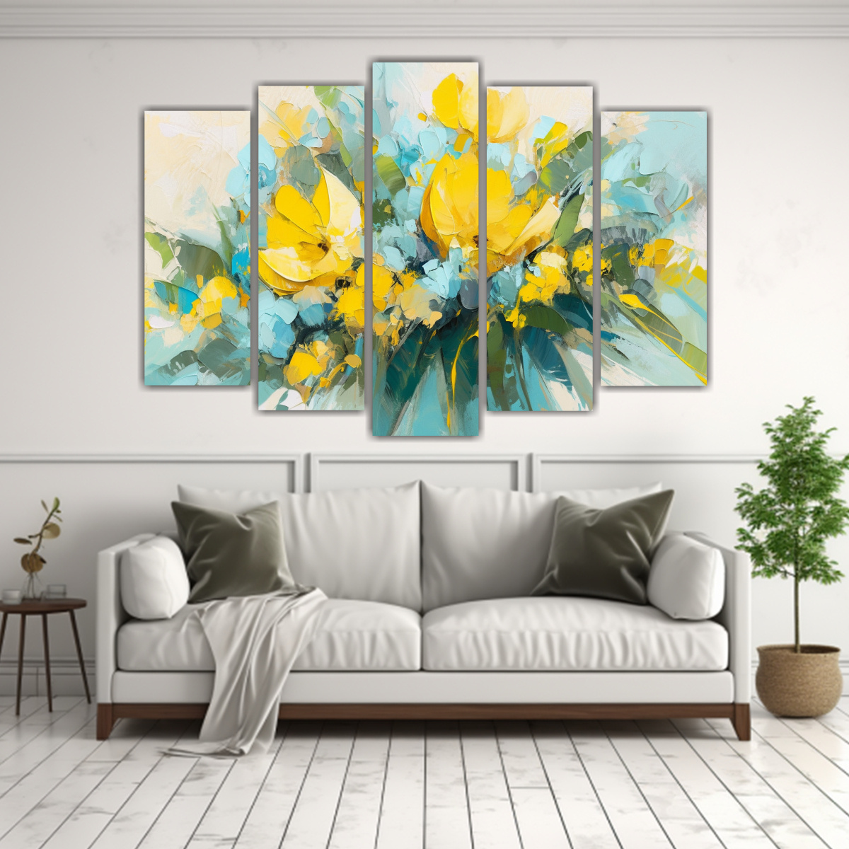 Decora tu hogar con la belleza de las flores amarillas y turquesas en este lienzo de alta calidad Los tonos beige, dorado, azul marino grisaceo, gris, plateado, chocolate y turquesa brindan un toque único a tu espacio